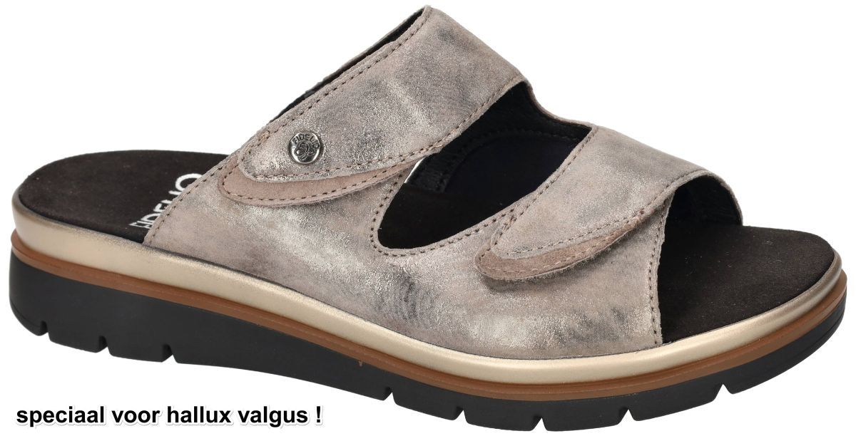 HALLUX by FIDELIO artikel/model 595020 HALLUX GLORY (G) 68 Umbra Lisa zijn taupe / oud-zilver glinster-nubuck damesschoenen medisch orthopedische Hallux Valgus slippers of muil pantoffels van het Oostenrijkse schoenenmerk FIDELIO HALLUX. Deze super comfortabele Fidelio Hallux damesslipper heeft een gelaagde plateauzool met 2 cm reële hielhoogte en een brede G½ wijdte leest voor de wat bredere en zware voeten. Fidelio slippers zijn voorzien van een dik uitneembare hallux steunzool vervaardigd van schokabsorberend kurk en met velour bekleed. Deze anatomisch gevormd geïntegreerde steunzool is speciaal in samenwerking met orthopedisten ontworpen om de druk op de hallux valgus te verlichten. Uiteraard is het mogelijk om dit los voetbed te vervangen door uw eigen steunzolen. Ter hoogte van de hallux valgus (grote teen) is een zacht strechleder inzetstuk voorzien ompijnlijke druk op deze plaats te voorkomen. Fidelio Hallux schoenen en slippers vindt men in onze schoenenwinkel regio Aalst, Ninove, Geraardsbergen, Liedekerke of kan men online bestellen op onze webshop.
