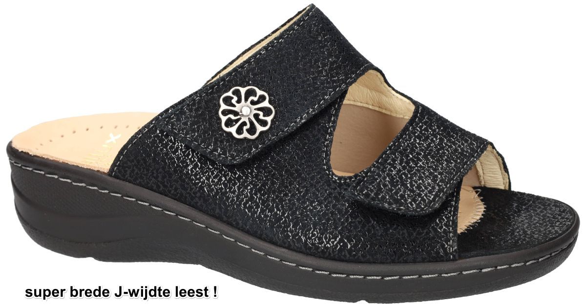 HALLUX by FIDELIO artikel/model 456005 JESSY (J) 10 schwarz float zijn super brede zwarte nubuck met subtiele glinsterende patroon-print damesschoenen medisch orthopedische Hallux Valgus slipper of muil pantoffel van het Oostenrijkse schoenenmerk FIDELIO HALLUX. Deze super brede comfortabele Fidelio Hallux damesslipper heeft hak 3 cm en een extra brede J wijdte leest voor zeer brede en dikke of gezwollen voeten. De Jessy J slipper van Fidelio Hallux is voorzien van een zachte stretch-zone ter hoogte van de hallux. Eveneens geschikt voor diabetes, revalidatie, en obesitas patiënten. Deze Fidelio hallux slippers zijn voorzien van een dik uitneembare hallux-steunzool vervaardigd uit schokbestendig en veerkrachtig kurk met leder bekleed. Deze geïntegreerde steunzool is speciaal in samenwerking met orthopedisten ontworpen om de druk op de hallux valgus te verlichten. Uiteraard is het mogelijk om dit los voetbed te vervangen door uw eigen steunzolen. Ter hoogte van de hallux valgus (grote teen) is een zacht strechleder inzetstuk voorzien om pijnlijke druk op deze plaats te voorkomen. Fidelio Hallux schoenen, sandalen en slippers kan men aanschaffen in onze schoenenwinkel regio Aalst, Ninove, Geraardsbergen, Zottegem, Liedekerke of online bestellen op onze webshop.