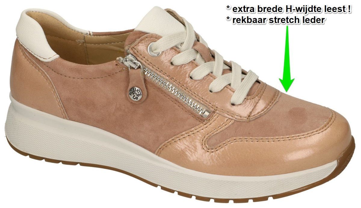 FIDELIO 1 for all multistetch serie artikel/model 566104 MULTISTRETCH HEAVEN H 76 Antico Charmel/Amalf zijn oudroze extra brede damesschoenen comfortschoenen sneakers of sportieve veterschoenen van het Oostenrijkse schoenenmerk FIDELIO multistretch. Deze orthopedische comfort vrouwenschoenen hebben een extra brede H-wijdte leest en zijn voorzien van zowel veters als een ritssluiting waardoor men ze perfect kan aanpassen aan elke voet. Het speciale bovenleder van deze ruime comfort sneaker is vervaardigd met rekbaar stretchleder om hallux valgus, hamertenen en andere knobbels of gewoon zeer brede voeten te ontlasten. Voorzien van dik los uitneembaar anatomisch kurk voetbed dat desgewenst perfekt kan vervangen worden door uw eigen steunzolen. Deze super comfortschoenen zijn zowel upper als binnenvoering uitgevoerd in 100% hoogkwaliteit mals kalfsleder en staan op een schokabsorberende en veerkrachtige ondersteunende anti-slip loopzool. Hoogcomfortschoen voor dames met wat bredere voet met toch jonge en sportieve looks. Fidelio multistretch orthopedische schoenen kan men kopen in onze schoenenwinkel regio Aalst, Ninove, Geraardsbergen, Zottegem, Liedekerke of kan men online bestellen op onze webshop.