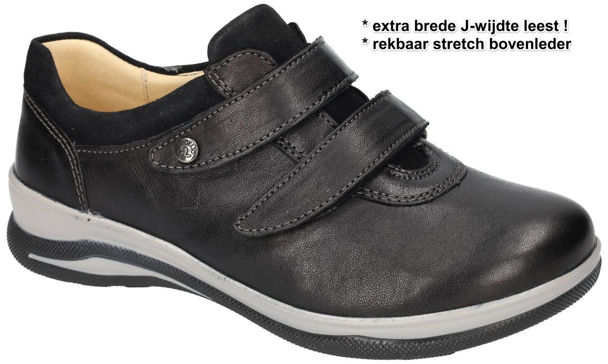 FIDELIO Hallux Multistretch artikel/model 387102 hallux JALEY J 60 schwarz Pangea/kombi zijn zwarte super brede damesschoenen sportieve comfortschoenen bandschoen sneakers of klittenbandschoenen (velcro) van het Oostenrijkse schoenenmerk FIDELIO. Deze orthopedische comfort vrouwenschoenen hebben een super brede J-wijdte leest en een dubbele velcro-sluiting. Het bovenleder van deze ruime comfort sneaker velcroschoenen is vervaardigd met rekbaar stretchleder om hallux valgus, hamertenen en andere knobbels te ontlasten. Voorzien van dik los uitneembaar anatomisch kurk voetbed dat desgewenst perfekt kan vervangen worden door uw eigen steunzolen. Deze super comfortschoenen zijn zowel upper als binnenvoering uitgevoerd in 100% hoogkwaliteit mals kalfsleder en staan op een schokabsorberende en veerkrachtige ondersteunende loopzool. Hoogcomfortschoen voor dames met wat bredere voet met toch jonge en sportieve looks.