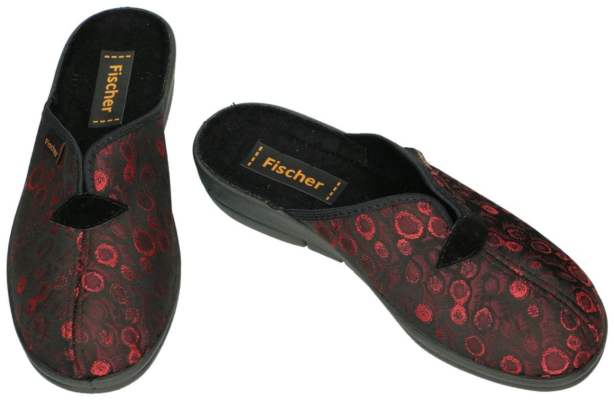 Fisher Markenschuh artikel/model 203620 - 341 bordo zijn bordeaux/donkerrood dames muil pantoffels (muil sloffen) of slippers van de Oostenrijkse schoenenfabrikant FISCHER-MARKENSCHUH.Deze vrouwen sloffen zijn uitgevoerd in een zwart met donker rood en bordeaux bollen en circels patroon bedrukte damesschoenen aansteek of instap pantoffel met een binnenvoering van katoen-textiel en waarvan de upper vervaardigd in een cirkels en bollen motief in zwart, rood en donkerrode kleuren. Deze Fischer dames pantoffels hebben een ruime H-wijdte leest voor de wat bredere voeten en staan op een antislip PU flexibele onderzool. Unieke warme winter sloffen voor vrouwen. Fischer-Markenschuh schoenen, pantoffels en sandalen vindt men in onze schoenenwinkel regio Aalst, Ninove, Geraardsbergen of kan men online bestellen op onze webshop.
