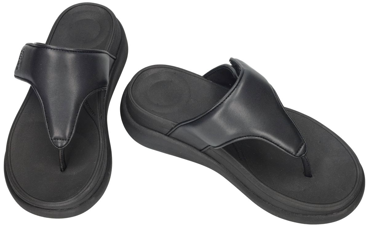 Deze aanpasbare dames teenslippers van FitFlop, model F-Mode Go Adjustable Flatform Toe-Post Sandals met artikelnummer IW1-090 in de uitvoering All Black, combineren een strak, minimalistisch design met het ergonomische comfort waar FitFlop wereldwijd om bekendstaat. De brede, verstelbare wreefband zorgt voor een perfecte pasvorm en maakt dit model bijzonder geschikt voor verschillende voettypes, ook wanneer de voet wat meer volume vraagt. De zachte teenpost is comfortabel afgewerkt en voorkomt wrijving tussen de tenen. Dankzij de volledig zwarte uitvoering ogen deze teenslippers tijdloos, modern en makkelijk combineerbaar – van city look tot vakantie-outfit. Zoals je van FitFlop mag verwachten, is ook dit model uitgerust met een lichtgewicht, schokabsorberende flatformzool die de impact tijdens het stappen merkbaar vermindert. De ergonomisch gevormde zool ondersteunt de natuurlijke afwikkeling van de voet en draagt bij tot een betere houding en minder vermoeide benen, zelfs bij langdurig dragen. De licht verhoogde flatform geeft subtiel extra hoogte zonder in te boeten aan stabiliteit. De F-Mode Go teenslippers zijn vervaardigd uit duurzame, onderhoudsvriendelijke materialen en lenen zich perfect voor dagelijks gebruik in warmere seizoenen. Ideaal voor vrouwen die op zoek zijn naar een comfortabele, verstelbare en stijlvolle teenslipper met een sportief-chique uitstraling. Een veelzijdige zomeressential voor wie design, functionaliteit en FitFlop-comfort in één slipper wil verenigen. Fitflop slippers en sandalen vindt men in onze schoenenwinkel regio Aalst, Ninove, Geraardsbergen of kan men online bestellen op onze webshop.