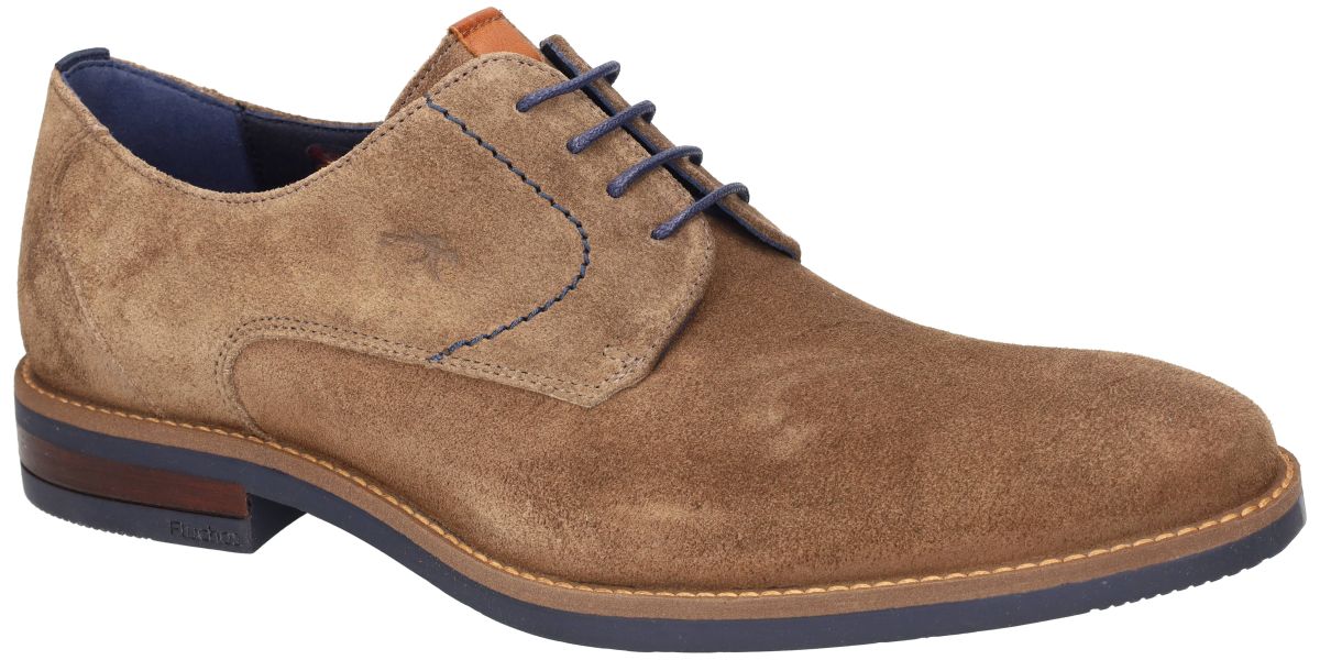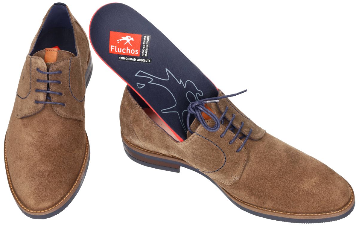 Fluchos THEO F1643 Afelpado Marmota Geklede herenschoenen in opgeruwd nubuck taupe . De Fluchos THEO F1643 in de uitvoering afelpado marmota is een stijlvolle en comfortabele geklede herenschoen die perfect past onder een kostuum of een verzorgde smart casual outfit. Dit Spaanse kwaliteitsmerk staat bekend om zijn vakmanschap en uitzonderlijk draagcomfort en dat voel je meteen bij dit model. Het bovenwerk is uitgevoerd in een ruig opgeruwd nubuck in een warme taupe kleur (marmota). De fluweelzachte, licht geruwde afwerking geeft de schoen een luxueuze en natuurlijke uitstraling. De subtiele kleurschakeringen in het leder zorgen voor diepte en karakter, waardoor elke schoen een uniek aspect krijgt. Qua design kiest Fluchos voor een tijdloos derby-model met een elegante, slanke leest. Opvallend zijn de contrasterende blauwe veters en stiknaden, die het geheel een moderne toets geven. De donkerblauwe binnenvoering versterkt dit kleuraccent en zorgt voor een verfijnde afwerking. Het discrete Fluchos-logo aan de zijkant onderstreept de kwaliteit zonder opdringerig te zijn. De zool is stijlvol opgebouwd met een combinatie van een bruine tussenzool en een donkerblauwe loopzool, wat het geheel een eigentijdse uitstraling geeft. De licht verhoogde hak en nette randafwerking maken deze schoen ideaal als kostuumschoen, maar ook perfect draagbaar onder een chino of geklede jeans. Binnenin biedt de THEO het comfort waar Fluchos om bekend staat: een aangenaam voetbed en een soepele constructie die meebeweegt met de voet. Bovendien is dit model Made in Spain, wat garant staat voor hoogwaardige materialen en ambachtelijke afwerking. Fluchos THEO F1643 afelpado marmota is de ideale keuze voor de moderne man die elegantie wil combineren met comfort. Een geklede herenschoen in taupe opgeruwd nubuck die klasse en draaggemak moeiteloos samenbrengt. FLUCHOS schoenen in onze schoenenwinkel regio Aalst, Ninove, Geraardsbergen, Zottegem, Liedekerke of kan u online bestellen op onze webshop.