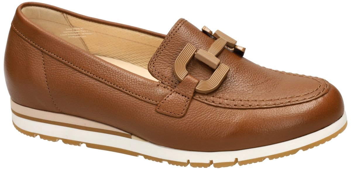 Deze Gabor loafers / mocassins uit de nieuwe lente- en zomercollectie combineren tijdloze elegantie met het gekende Gabor-comfort. Dit model met artikelnummer 82.416.53 is uitgevoerd in Cervo camel, een warme caramelbruine tint die perfect aansluit bij zowel casual als meer geklede outfits . De upper in fijn generfd gladleder straalt kwaliteit en verfijning uit. Het zachte leder voelt aangenaam soepel aan en past zich mooi aan de voet aan. Over de wreef zorgt een originele cacaobruine “paardenbit”-decoratie voor een stijlvolle, modieuze toets die deze loafer net dat tikkeltje extra karakter geeft. Dankzij de G-wijdte leest biedt deze Gabor mocassin een comfortabele pasvorm voor de gemiddelde tot iets bredere voet. Binnenin is de schoen voorzien van een uitneembaar voetbed, wat ideaal is voor wie eigen steunzolen draagt. Het voetbed kan eenvoudig vervangen worden zonder in te boeten aan draagcomfort of stabiliteit. De lichte, schokabsorberende zool vangt elke stap soepel op en zorgt voor aangenaam loopcomfort, ook bij langer dragen. De subtiele verhoging in de zool geeft extra ondersteuning zonder zwaar aan te voelen. De neutrale zoolkleur sluit mooi aan bij het warme camel-leder en versterkt de verzorgde uitstraling van de schoen. Extra noemenswaardig zijn ook de verzorgde stiknaden rond de neus, de nette afwerking van de hiel en de zachte microfiber binnenvoering die bijdraagt aan een aangenaam voetklimaat. Kortom: deze Gabor loafers zijn de ideale keuze voor vrouwen die op zoek zijn naar een comfortabele, elegante en veelzijdige instapper met uitneembaar voetbed, perfect voor het lente- en zomerseizoen. Gabor mocassins en loafers vindt men in onze schoenenwinkel regio Aalst, Ninove, Geraardsbergen, Zottegem, Liedekerke of kan men online bestellen op onze webshop. OOK ANDERE MATEN KUNNEN BESTELD WORDEN ! van maat 35 tot 44 halve maten inclusief!