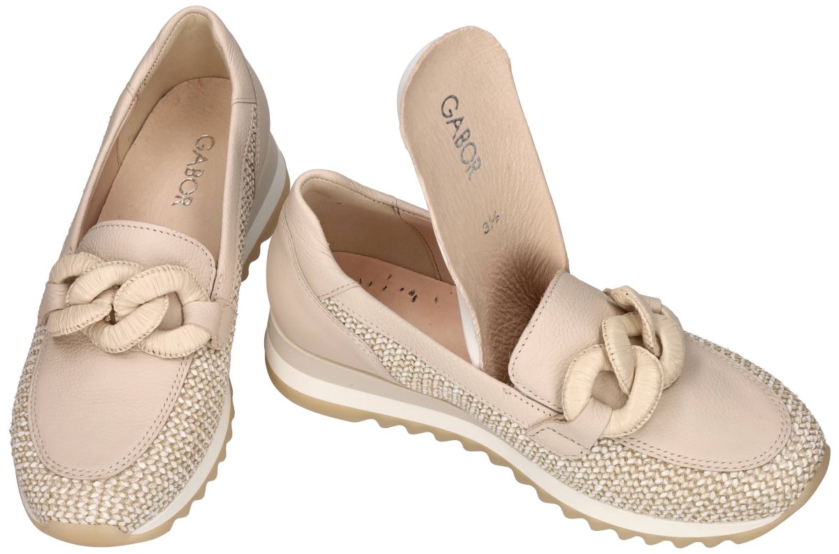 Gabor Loafer 83.471.42 – Elegantie en Comfort in één . Ontdek deze stijlvolle Gabor loafers 83.471.42 uit de nieuwe lente/zomercollectie 2026 van het Duitse schoenenmerk Gabor, een perfecte combinatie van tijdloze elegantie en uitzonderlijk draagcomfort. Deze instap damesschoen zijn uitgevoerd in een luxe mix van raffia vlechtwerk en hoogwaardig crème leer in de kleuren beige en crème-wit, waardoor hij moeiteloos past bij elke zomerse outfit. Een opvallend decoratief element is de met raffia omwonden ketting met dikke schakels op de wreef, die deze loafer een unieke en modieuze uitstraling geeft. Het subtiele samenspel van natuurlijke tinten en texturen benadrukt de hoogwaardige afwerking en stijl van deze schoen. De "Best Fitting"-lijn van Gabor biedt extra ruimte bij de bal van de voet, wat zorgt voor optimaal comfort. Met een leest in wijdte F is deze loafer ideaal voor een normale voetbreedte. Het uitneembare voetbed maakt het mogelijk om de schoen aan te passen aan individuele behoeften, bijvoorbeeld door eigen steunzolen te plaatsen. Zo combineert Gabor mode met functionaliteit en ergonomie. De flexibele zool zorgt voor een soepele afwikkeling van de voet, terwijl het lichte gewicht en het ademende materiaal bijdragen aan een aangenaam draaggevoel, zelfs op warme dagen. De Gabor loafer 83.471.42 is de ideale keuze voor dames die stijl en comfort willen combineren. Of je nu een casual look creëert of een chique outfit wilt afmaken, deze loafer biedt veelzijdigheid en verfijning. Gabor ballerina's vindt men in onze schoenenwinkel regio Aalst, Ninove, Geraardsbergen of kan men online bestellen op onze webshop. OOK ANDERE MATEN KUNNEN BESTELD WORDEN ! van maat 35 tot 44 halve maten inclusief!