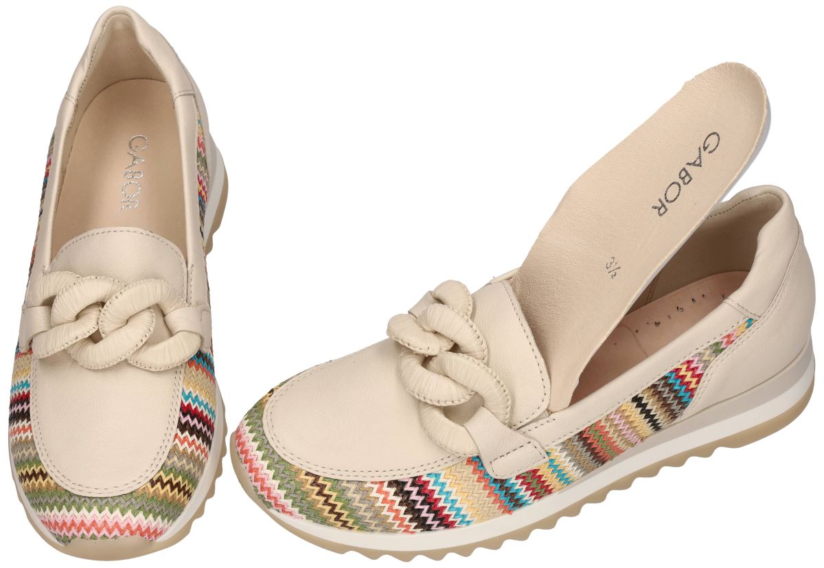 Maak kennis met deze kleurrijke Gabor loafers 83.471.45 in de uitvoering multicolour/panna, een echte blikvanger uit de nieuwste lente/zomercollectie. Deze trendy snoafers combineren elegantie met een speelse, zomerse uitstraling en tillen elke outfit moeiteloos naar een hoger niveau. Het unieke design springt meteen in het oog. De upper is uitgevoerd in crème gladleder (panna), gecombineerd met een verfijnd multicolor raffia vlechtwerk in frisse zomertinten zoals groen, rood, turquoise, roze en naturel. Dit kleurrijke weefpatroon geeft de schoen een luchtige, ambachtelijke uitstraling. De wreef wordt extra geaccentueerd door een opvallende ketting met grote schakels, stijlvol omwikkeld met crème raffia – een luxueus detail dat deze loafer een uitgesproken modieuze look geeft. Deze loafer blijft gegarandeerd niet onopgemerkt. Ook qua comfort voldoet deze Gabor aan de hoogste verwachtingen: Uitneembaar voetbed – ideaal voor wie eigen steunzolen draagt. F-wijdte leest – comfortabele pasvorm voor de normale voet. Lederen binnenbekleding – zorgt voor een ademend en aangenaam draaggevoel. Schokabsorberende rubberen zool met karakteristiek haaientandprofiel – licht, flexibel en tegelijk stabiel, voor een zachte en veilige afrolbeweging. De subtiel verhoogde, sportieve zool met contrasterende lagen geeft de schoen bovendien een hedendaagse, casual-chique uitstraling. Met deze Gabor 83.471.45 kiest u voor een perfecte mix van comfort, kwaliteit en uitgesproken design – een zomerse statement loafer die zowel bij een elegante broek als bij een luchtige jurk schittert. De nieuwste collectie Gabor damesschoenen vindt men in onze schoenenwinkel regio Aalst, Ninove, Geraardsbergen, Zottegem, Liedekerke of kan men online bestellen in onze webshop.