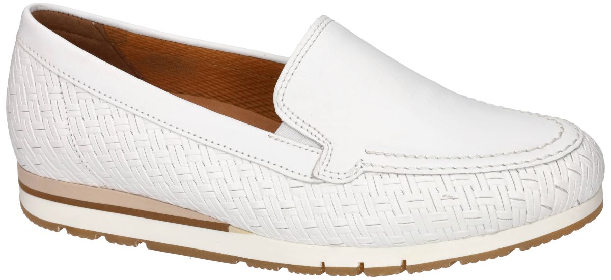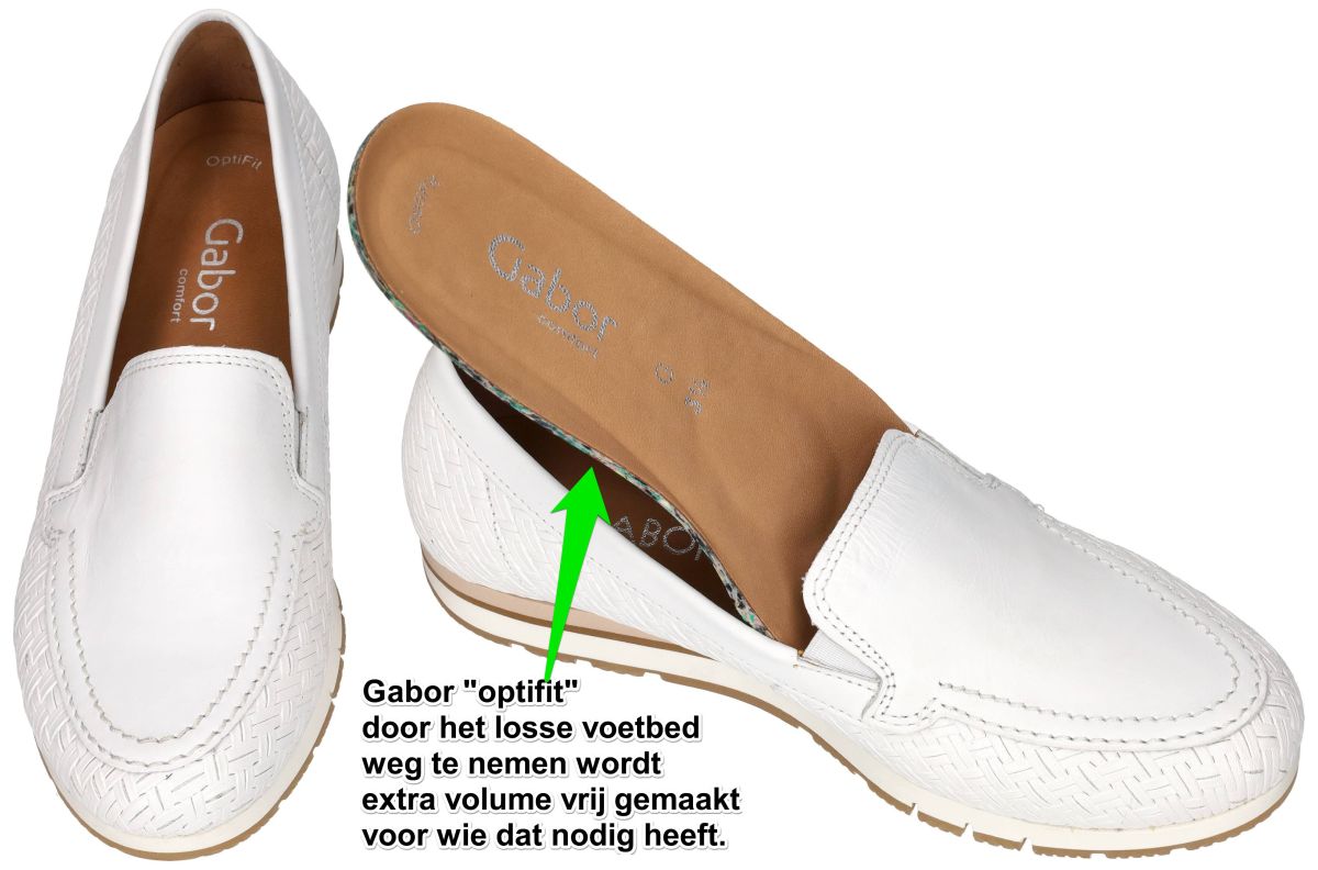 Gabor mocassins 82.414.60 – Flecht/Nappa Weiss zijn stijlvolle zomerse loafers met optimaal comfort. Deze elegante mocassins uit de nieuwste lente/zomercollectie van Gabor combineren verfijnde uitstraling met hoogwaardig draagcomfort. Het model 82.414.60 in de frisse uitvoering Flecht/Nappa weiss is vervaardigd uit soepel wit nappaleer, prachtig gecombineerd met een vlechtwerk-print rondom de voorvoet en de zijkanten. Dit subtiele reliëf zorgt voor een luchtige, zomerse look én geeft de schoen een luxueuze afwerking. Dankzij de ruime G-wijdte leest biedt dit model een comfortabeler pasvorm voor dames met een gemiddelde tot iets bredere voet. Binnenin zorgt het Gabor Optifit-systeem voor extra flexibiliteit: het uitneembare voetbed kan eenvoudig vervangen worden door eigen steunzolen of volledig verwijderd worden wanneer er extra volume in de schoen nodig is. De mocassin staat op een lichte sleehak die de hiel ongeveer 1,5 cm hoger tilt en zo een natuurlijke, ontspannen houding stimuleert. De schokabsorberende zool zorgt voor een zacht loopgevoel en dempt elke stap, ideaal voor langere dagen onderweg. De twee kleine elastische inzetjes aan de wreef – discreet weggewerkt in het design – verbeteren de instap en zorgen ervoor dat de loafer soepel meebeweegt met de voet. De rubberen loopzool heeft een subtiel profiel voor meer grip, terwijl de zand- en crèmetinten in de zool mooi contrasteren met het zuivere wit van het bovenmateriaal. Het leder gevoerde binnenwerk zorgt voor een aangenaam voetklimaat, ook op warmere dagen. Deze Gabor loafers vormen de perfecte mix van elegantie, fris zomerdesign en het gekende Gabor-comfort. Ideaal voor dagelijks gebruik, zowel casual als gekleed. Gabor mocassins en loafers vindt men in onze schoenenwinkel regio Aalst, Ninove, Geraardsbergen of kan men online bestellen op onze webshop. OOK ANDERE MATEN KUNNEN BESTELD WORDEN ! van maat 35 tot 44 halve maten inclusief!