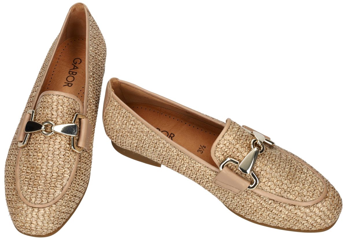 Gabor 85.214.44 Raffia/Nappa Sand/Steppa Sjieke zomerse loafers in beige raffia. Deze elegante Gabor loafers 85.214.44 uit de nieuwe lente/zomercollectie stralen pure klasse en verfijning uit. De uitvoering Raffia/Nappa sand/steppa combineert natuurlijke materialen met een luxueuze afwerking en maakt van deze loafer een stijlvolle blikvanger voor het zomerseizoen. De upper is uitgevoerd in een prachtige beige zandkleurige raffia met fijn vlechtwerk. Het subtiele, ambachtelijk ogende weefpatroon geeft de schoen een luchtige en exclusieve uitstraling. De warme zandtint maakt deze loafer bijzonder veelzijdig en eenvoudig te combineren met zowel lichte als neutrale zomertinten. De fijne omboording in soepel nappa leder zorgt voor een elegante afwerking en benadrukt de verfijnde belijning van het model. De licht afgeronde, iets vierkantere neus geeft de schoen een moderne touch zonder zijn tijdloze karakter te verliezen. Blikvanger op de wreef is de glanzende goudkleurige metalen schakel, die de loafer een luxueuze, geklede uitstraling geeft. Het decoratieve element contrasteert prachtig met het natuurlijke raffia en tilt het geheel naar een hoger stijlniveau subtiel chic zonder overdaad. De schoen rust op een vlakke, dunne zool met een laag blokhakje van ongeveer 1 cm, wat zorgt voor een elegante houding en aangenaam draagcomfort. De slanke zool versterkt het verfijnde silhouet en maakt deze loafer ideaal voor zowel formele als casual-chique gelegenheden. Binnenin biedt de schoen een comfortabele afwerking, passend bij de kwaliteit waar Gabor om bekendstaat. De warme cognackleurige binnenzool zorgt bovendien voor een mooi contrast met het lichte bovenwerk. Gabor 85.214.44 raffia/nappa sand/steppa is de perfecte keuze voor dames die op zoek zijn naar een geklede, zomerse loafer met natuurlijke charme en een vleugje luxe. Combineer deze stijlvolle instapper met een linnen broek, een elegante jurk of een zomerse culotte voor een tijdloze, vrouwelijke look. Gabor mocassins en loafers vindt men in onze schoenenwinkel regio Aalst, Ninove, Geraardsbergen, Zottegem, Liedekerke of kan men online bestellen op onze webshop.
