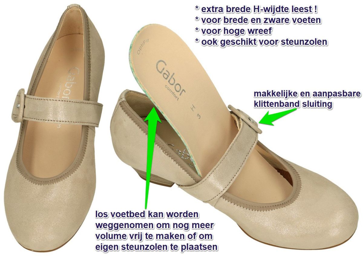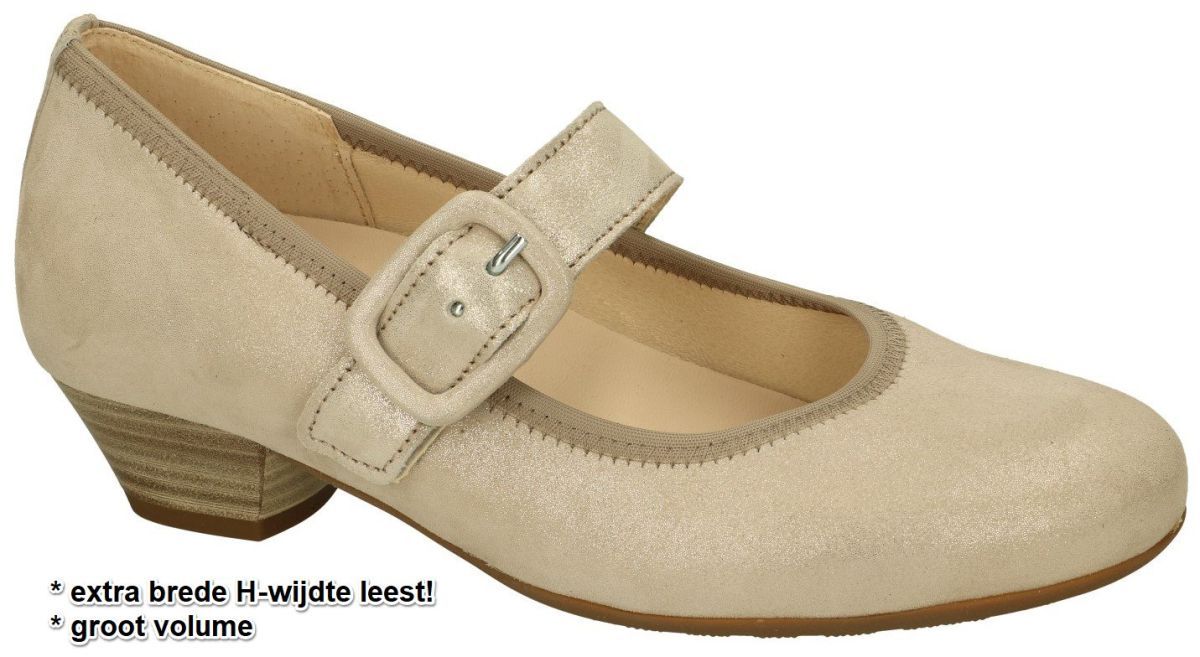 GABOR artikel/model 46.139.14 Drill muschel wechselfußbett zijn beige glitter-nubuck damesschoenen pumps bandschoenen uit de nieuwe zomer/lente 2024 collectie van het Duitse schoenenmerk Gabor. Deze comfort bandschoen pumps zijn uitgevoerd in een fijn glinsterend beige/goud nubuck leder met een brede klittenband over de wreef en met een grote gesp als decoratie. De comfort Gabor pumps staan op een gemakkelijke blokhakje met hielhoogte 3,5 cm en hebben een zeer brede H-wijdte leest speciaal voor brede en zware voeten. Bovendien zijn deze Gabor pumps voorzien van optifit uitneembaar voetbed dat als dit weggenomen wordt nog eens extra ruimte vrijmaakt voor nog bredere voeten of voor het plaatsen van eigen steunzolen. Door de brede band over de wreef blijven deze pumps makkelijk zitten en door de elastiek inzet + de klittenbandsluiting is deze band perfect aanpasbaar aan elke voet. Gabor damesschoenen vindt men in ruime keuze in onze schoenenwinkel regio Aalst, Ninove, Geraardsbergen, Zottegem, Liedekerke of kan men online bestellen en kopen op onze webshop.