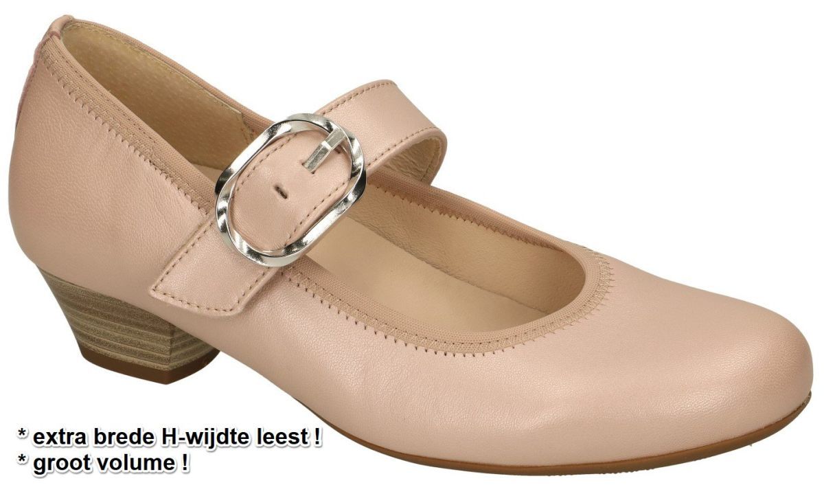 GABOR artikel/model 26.139.63 Samoa perlato antikrosa wechselfußbett zijn nude of oudroze damesschoenen pumps bandschoenen uit de nieuwe zomer/lente 2023 collectie van het Duitse schoenenmerk Gabor. Deze comfort bandschoen pumps zijn uitgevoerd in soepel zacht parelmoer-glanzend oud roze leder met een brede klittenband over de wreef en met metalen gesp als decoratie. De comfort Gabor pumps staan op een gemakkelijke blokhakje met hielhoogte 3,5 cm en hebben een zeer brede H-wijdte leest speciaal voor brede en zware voeten. Bovendien zijn deze Gabor pumps voorzien van optifit uitneembaar voetbed dat als dit weggenomen wordt nog eens extra ruimte vrijmaakt voor nog bredere voeten of voor het plaatsen van eigen steunzolen. Door de brede band over de wreef blijven deze pumps makkelijk zitten en door de elastiek inzet + de klittenbandsluiting is deze band perfect aanpasbaar aan elke voet. Gabor damesschoenen vindt men in ruime keuze in onze schoenenwinkel regio Aalst, Ninove, Geraardsbergen, Zottegem, Liedekerke of kan men online bestellen en kopen op onze webshop.
