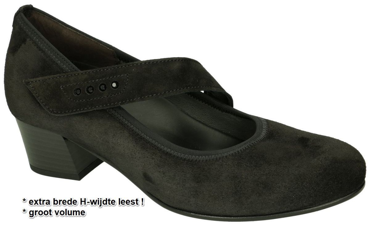 GABOR artikel/model 46.149.47 samtchevreau schwarz wechselfußbett zijn zwarte nubuck damesschoenen pumps bandschoenen uit de nieuwe 2024 collectie van het Duitse schoenenmerk Gabor. Deze comfort bandschoen pumps zijn uitgevoerd in een mooi zacht zwart nubuck met een brede klittenband over de wreef en met enkele zwarte imitatie siersteentjes als decoratie. De comfort Gabor pumps staan op een gemakkelijke blokhak met hielhoogte 4,5 cm en hebben een zeer brede H-wijdte leest speciaal voor brede en zware voeten. Bovendien zijn deze Gabor pumps voorzien van optifit uitneembaar voetbed dat als dit weggenomen wordt nog eens extra ruimte vrijmaakt voor nog bredere voeten of voor het plaatsen van eigen steunzolen. Door de brede band over de wreef blijven deze pumps makkelijk zitten en door de elastiek inzet + de klittenbandsluiting is deze band perfect aanpasbaar aan elke voet. Gabor damesschoenen vindt men in ruime keuze in onze schoenenwinkel regio Aalst, Ninove, Geraardsbergen, Zottegem, Liedekerke of kan men online bestellen en kopen op onze webshop.