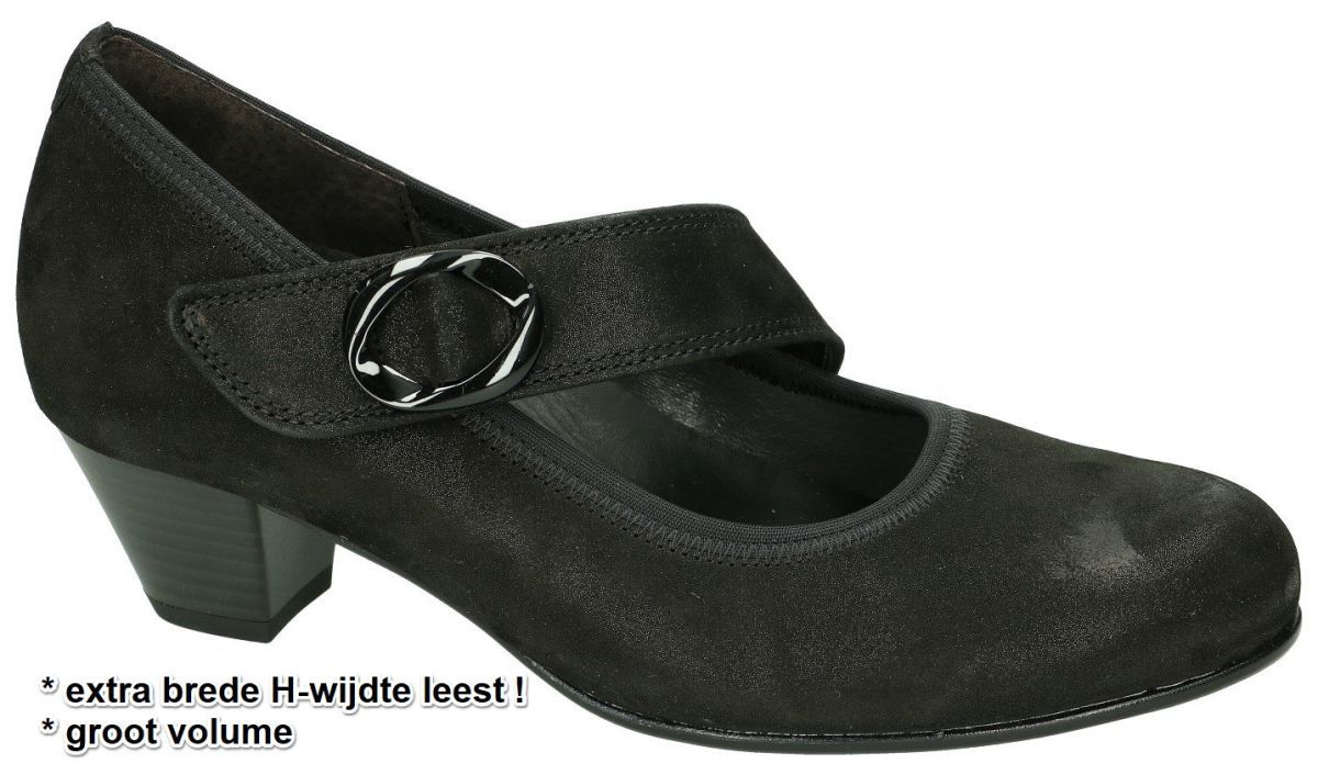 Elegante Gabor Pumps voor Extra Comfort en extra volume. Ontdek de Gabor pumps in zwart glinsterend nubuck, perfect voor dames ietwat bredere voeten en/of een hoge wreef. Deze stijlvolle pumps bieden uitzonderlijk comfort dankzij de extra brede H-wijdte leest, het Optifit comfort systeem en het grote volume. Ze zijn voorzien van een stabiele blokhak van 4,5 centimeter en een praktisch klittenband dat schuin over de wreef loopt. Met een uitneembaar voetbed zijn deze pumps ideaal voor het gebruik van steunzolen of extra ruimte. Combineer elegantie en comfort met deze veelzijdige Gabor pumps. Gabor damesschoenen vindt men in ruime keuze in onze schoenenwinkel regio Aalst, Ninove, Geraardsbergen, Zottegem, Liedekerke of kan men online bestellen en kopen op onze webshop.