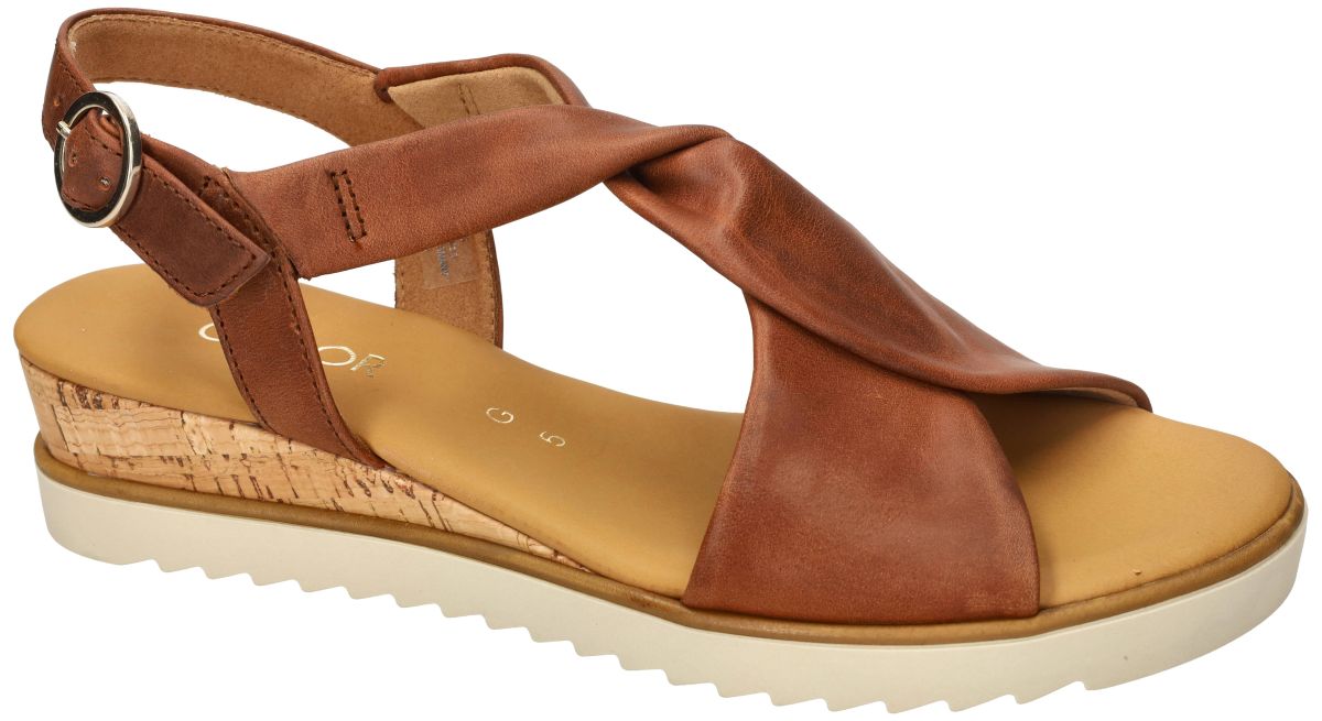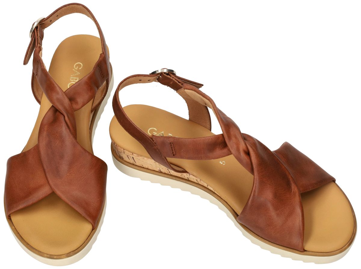 Gabor 82.751.53 Vacchetta camel cognac bruine sandalen met kurk sleehak. Deze elegante Gabor sandalen 82.751.53 uit de nieuwe lente/zomer collectie combineren minimalistisch design met hoog comfort. De uitvoering Vacchetta camel straalt pure frisheid uit dankzij het hoogwaardige cognac bruine leder en de natuurlijke accenten in de zool. Het bovenwerk is uitgevoerd in soepel kastanjebruin leder met een verfijnde kleurschakering. Blikvanger in het ontwerp zijn de twee cognac bruine lederen banden die over elkaar gekruist en subtiel getorst worden over de wreef. Dit speelse, maar elegante detail geeft de sandaal een moderne en vrouwelijke uitstraling en zorgt tegelijk voor een mooie omsluiting van de voet. Deze sandaal is uitgevoerd op een comfortabele G-wijdte leest, wat garant staat voor een aangename pasvorm met net dat tikkeltje extra ruimte. Achteraan sluit de sandaal met een verstelbare gesp, waardoor u de pasvorm eenvoudig kunt aanpassen voor optimale stabiliteit. Binnenin geniet u van een mals lederen voetbed in een warme cognackleur. Dit zachte voetbed voelt aangenaam aan en ondersteunt de voet tijdens lange zomerdagen. De sandaal rust op een subtiele kurk sleehak die de hiel van de voet ongeveer 2,5 cm op lift. Deze lichte verhoging zorgt voor een elegante houding zonder aan comfort in te boeten. De combinatie van kurk met de cognackleurige rand geeft de sandaal een natuurlijke, zomerse uitstraling. Onder de schoen bevindt zich een stevige beige haaientand zool, die niet alleen zorgt voor een modieuze, sportieve toets, maar ook extra grip en stabiliteit biedt tijdens het stappen. Gabor 82.751.53 Vacchetta camel is de perfecte bruine zomersandaal voor dames die houden van een frisse, tijdloze look met comfort. Ideaal onder een luchtige jurk, een linnen broek of een casual zomerset. Een veelzijdige en stijlvolle must-have voor het nieuwe seizoen. Gabor sandalen vindt men in onze schoenenwinkel regio Aalst, Ninove, Geraardsbergen, Zottegem, Liedekerke of kan men online bestellen op onze webshop.