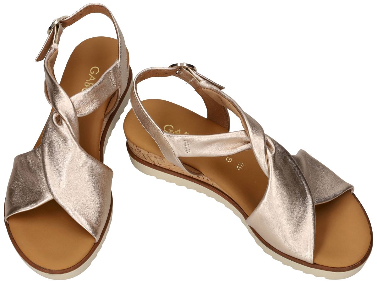 Gabor 82.751.82 – Satin Metallic Puder Elegante metallic sandalen met kurk sleehak. Deze verfijnde Gabor sandalen 82.751.82 uit de nieuwe lente/zomer collectie zijn de perfecte combinatie van comfort en subtiele glamour. De uitvoering Satin Metallic puder geeft deze sandaal een zachte goudkleurige, licht rosé metallic uitstraling die moeiteloos elegantie toevoegt aan elke zomerse outfit. Het bovenwerk is uitgevoerd in soepel metallic leder met een satijnachtige glans. De banden over de wreef gekruist en licht getorst, wat zorgt voor een speels, vrouwelijk effect en een mooie omsluiting van de voet. De zachte metallic tint geeft het ontwerp een luxueuze uitstraling zonder te overheersen. De sandaal is uitgevoerd op een comfortabele G-wijdte leest, wat garant staat voor een aangename, iets ruimere pasvorm. Achteraan zorgt een verstelbare gesp voor een perfecte aansluiting rond de hiel en extra stabiliteit tijdens het stappen. Binnenin bevindt zich een mals lederen voetbed in warme cognackleur, dat niet alleen zacht aanvoelt maar ook bijdraagt aan langdurig draagcomfort. Dit warme contrast met het metallic bovenwerk geeft de sandaal extra diepte en karakter. De sandaal rust op een subtiele kurk sleehak die de hiel van de voet ongeveer 2,5 cm op lift. Deze lichte verhoging zorgt voor een elegante houding terwijl het comfort behouden blijft. De combinatie van kurk, de cognackleurige rand en de stevige crème zool geeft de sandaal een mooie balans tussen natuurlijk en modern. De onderzijde is afgewerkt met een stevige beige haaientand zool, die zorgt voor extra grip en een sportieve toets toevoegt aan het verfijnde design. Gabor 82.751.82 Satin Metallic puder is de ideale keuze voor dames die houden van een comfortabele sandaal met een elegante metallic twist. Perfect voor zomerse feestjes, vakanties of gewoon als stijlvolle blikvanger onder een jurk, rok of linnen broek. Een luxueuze must-have voor het nieuwe seizoen. Gabor sandalen vindt men in onze schoenenwinkel regio Aalst, Ninove, Geraardsbergen, Zottegem, Liedekerke of kan men online bestellen op onze webshop.