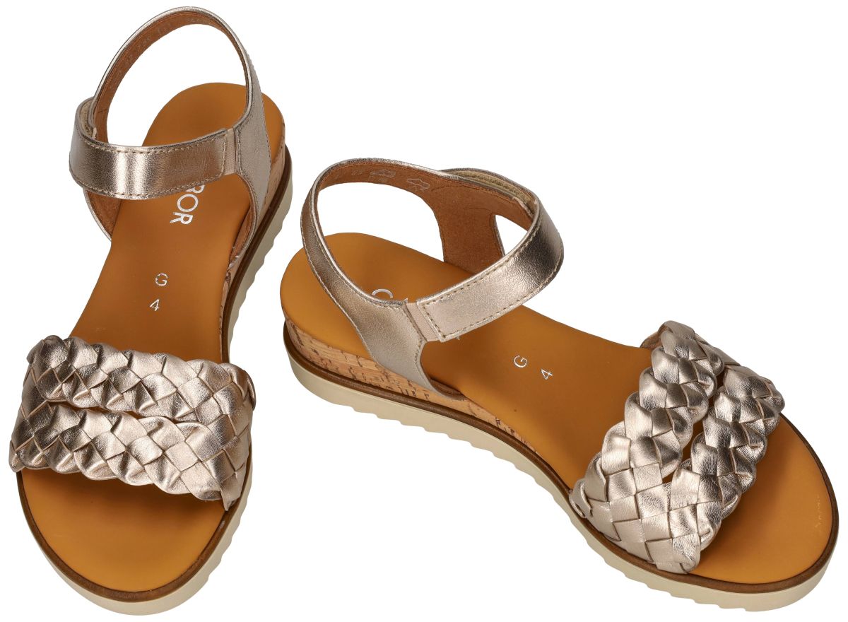 Gabor 82.759.89 Satin Metallic Puder Comfortabele sleehak sandalen met vlechtwerk. Deze elegante Gabor 82.759.89 sleehak sandalen uit de nieuwe lente/zomercollectie combineren verfijnde glamour met het vertrouwde Gabor comfort. De uitvoering Satin Metallic puder geeft de sandaal een zachte goud metallic glans met een subtiele champagne of poedertint perfect om zomerse outfits net dat tikkeltje extra uitstraling te geven. Het bovenwerk is vervaardigd uit soepel metallic leder en valt meteen op door het rijk uitgewerkte vlechtwerk boven de wreef. De brede, gevlochten band zorgt niet alleen voor een luxueuze uitstraling, maar omsluit de voet ook comfortabel en stabiel. Achteraan zorgt een verstelbare klittenbandsluiting rond de enkel voor een gemakkelijke instap en een perfecte pasvorm. Deze sandaal is uitgevoerd op een comfortabele G-wijdte leest, wat zorgt voor iets meer ruimte en een aangename draagervaring, ook bij een iets vollere voet. Binnenin bevindt zich een mals lederen voetbed in warme cognackleur, dat zacht aanvoelt en langdurig comfort biedt. De sandaal rust op een subtiele kurk sleehak met een hielhoogte van 2,5 cm. Deze lichte verhoging ondersteunt een natuurlijke houding zonder het comfort te compromitteren. De onderzijde is afgewerkt met een crèmekleurige zool met haaientandprofiel, wat zorgt voor extra grip én een sportieve toets aan het elegante design. De combinatie van kurk, cognac accenten en de lichte zool creëert een mooie balans tussen natuurlijk en modern. Gabor 82.759.89 Satin Metallic puder is de ideale keuze voor dames die houden van comfort, stabiliteit en een verfijnde metallic uitstraling. Perfect onder een zomerjurk, linnen broek of elegante city-look – een stijlvolle must-have voor het nieuwe seizoen. Gabor sandalen vindt men in onze schoenenwinkel regio Aalst, Ninove, Geraardsbergen, Zottegem, Liedekerke of kan men online bestellen op onze webshop.