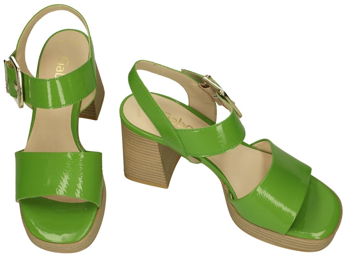 GABOR artikel model 44.780.99 softino lack granny green zijn fel groene lak lederen damesschoenen geklede sandalen op plateauzool en hoge blokhak uit de nieuwe lente/zomer 2024 collectie van het Duitse schoenenmerk GABOR. Deze elegante sjieke sandaal is uitgevoerd in een grasgroen of meigroen kreukellack en sluit aan met een grote goud-metallic gesp. Deze stijlvolle Gabor sandaal staat op een 8 cm hoge blokhak en vooraan op een plateauzool van 2 cm dik waardoor de werkelijke hielhoogte dus 6 cm is. Deze mooie Gabor sandaal heeft een lederen voetbed en is ook leder gevoerd. Gabor damesschoenen vindt men in onze schoenenwinkel regio Aalst, Ninove, Geraardsbergen of kan men online bestellen op onze webshop.OOK ANDERE MATEN KUNNEN BESTELD WORDEN ! van maat 35 tot 44 halve maten inclusief!