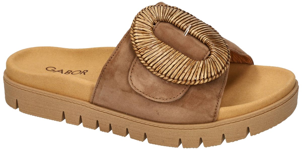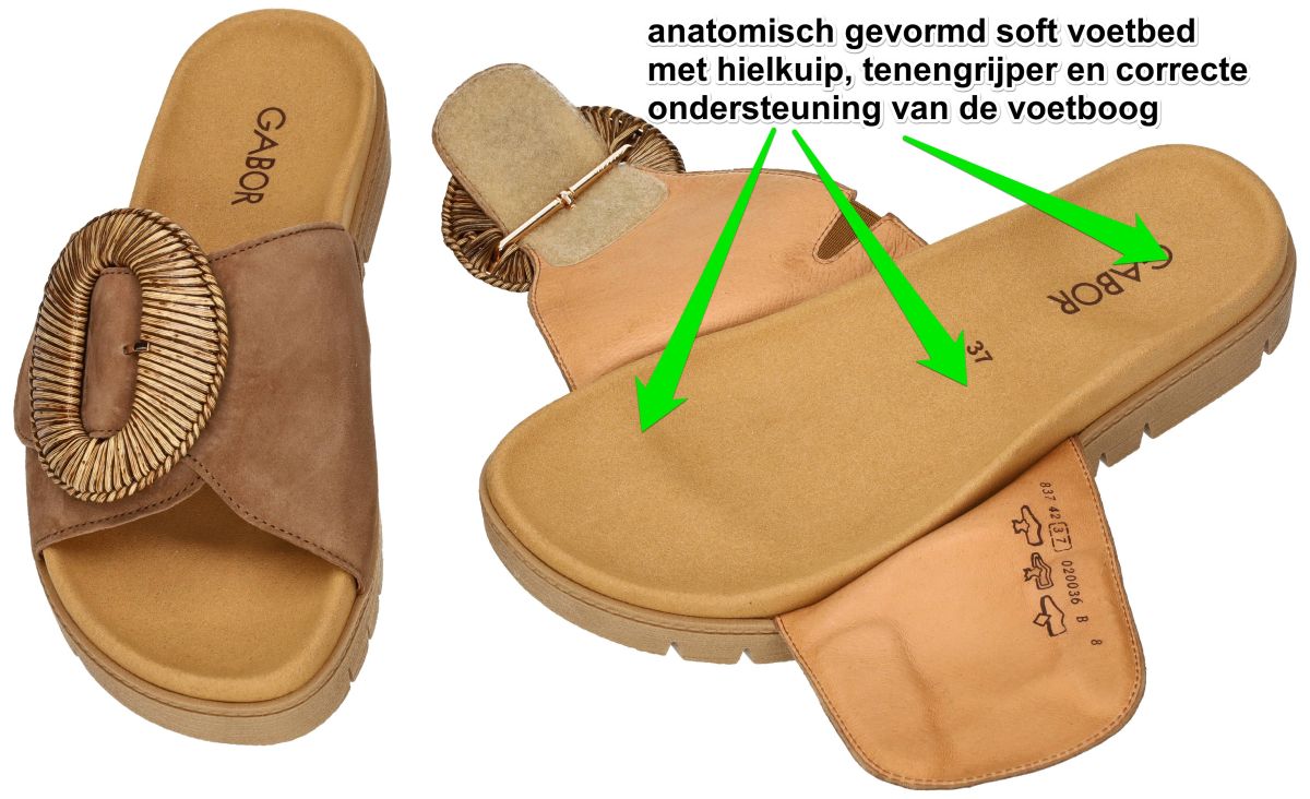 Gabor 83.742.14 Samtchevreau Peanut Modieuze slippers met anatomisch comfort (F-wijdte). Deze trendy damesslipper uit de nieuwe lente/zomer collectie van Gabor combineert fashion met doordacht comfort. Het model 83.742.14 in de uitvoering samtchevreau peanut is uitgevoerd in een comfortabele F-wijdte leest, wat staat voor een ietwat smalle tot gemiddelde pasvorm. De upper is vervaardigd uit zacht ree-bruin suède (samtchevreau peanut) met een warme, natuurlijke uitstraling. Blikvanger is de grote, opvallende en unieke met gelakt riet omwikkelde gesp op de wreef die deze slipper een uitgesproken modieuze look geeft. De gesp is louter decoratief; de effectieve sluiting gebeurt via een brede klittenband onder de wreefband. Hierdoor kan de slipper perfect aangepast worden aan verschillende voettypes en wreefhoogtes. Dit zorgt voor een stabiele en persoonlijke pasvorm. Het comfortabele voetbed is anatomisch gevormd en voelt zacht en veerkrachtig aan bij elke stap. Een subtiele opstaande rand rond de voet voor extra stabiliteit. Een ondersteunende hielkuip die de voet op zijn plaats houdt. Een lichte tenengrijper voor natuurlijke afwikkeling en die de tenen onbewust wat openspreidt. Gerichte ondersteuning onder de voetboog. Deze ergonomische opbouw bevordert een correcte houding en een aangename drukverdeling, ideaal voor langdurig zomers draagcomfort. Deze upper staat op een flexibele plateauzool in een warme gum natuurkleur. De licht verhoogde zool geeft een moderne uitstraling én extra demping tijdens het stappen. Het geprofileerde loopvlak zorgt voor voldoende grip. Gabor 83.742.14 Samtchevreau Peanut is een stijlvolle zomerslipper in F-wijdte die modieus design en anatomisch comfort perfect combineert. Een elegante must-have voor dames die comfort en uitstraling moeiteloos willen verenigen. Gabor slippers en sandalen vindt men in onze schoenenwinkel regio Aalst, Ninove, Geraardsbergen, Zottegem, Liedekerke of kan men online bestellen op onze webshop.