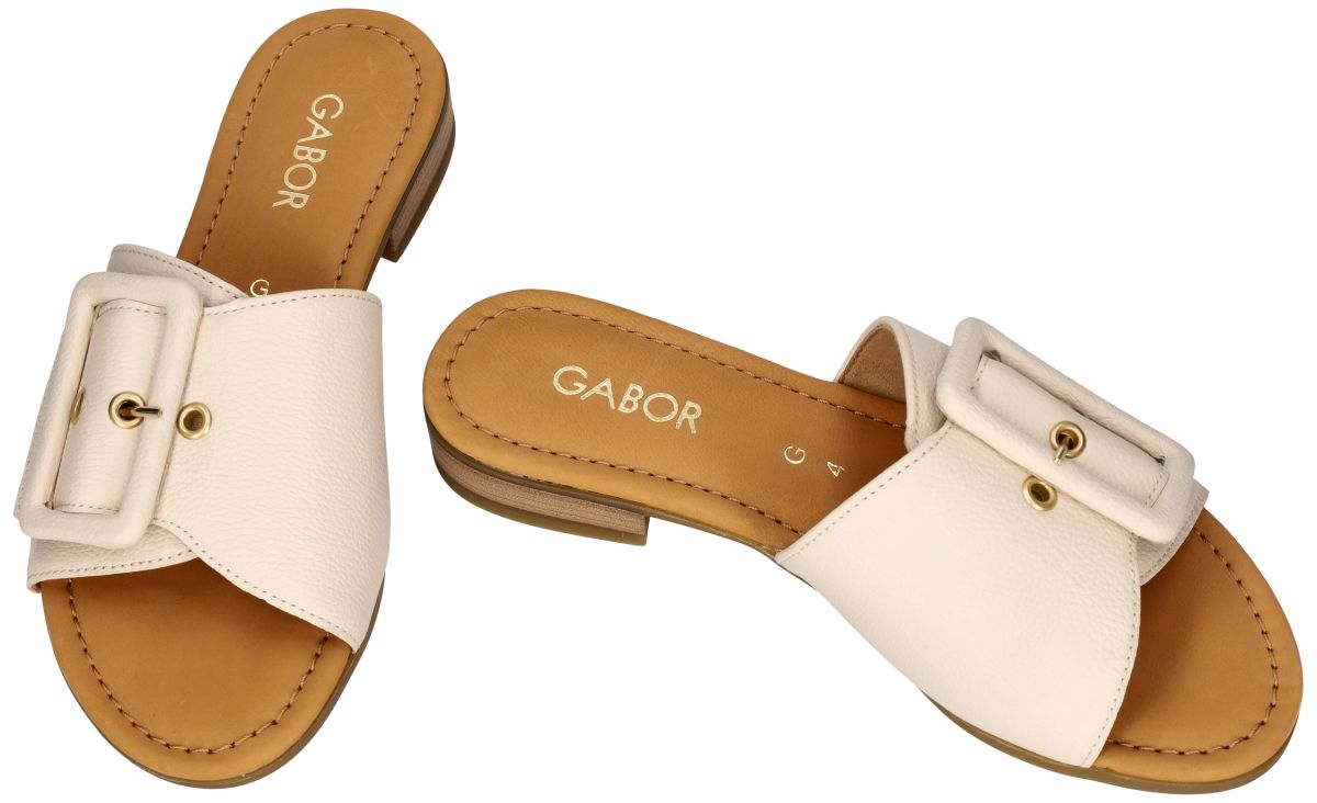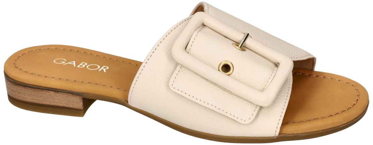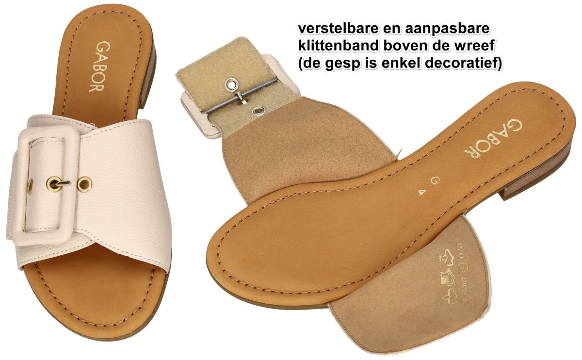 Dit stijlvolle dames muiltje van Gabor (artikel 82.791.52) in zacht crème leder combineert minimalistische elegantie met optimaal draagcomfort. Dankzij het open model schuift u deze slipper moeiteloos aan, ideaal voor warme dagen. De brede band over de wreef zorgt voor een stevige pasvorm en is verstelbaar met klittenband, terwijl de grote gesp een modieuze, decoratieve toets geeft. Het leder beklede voetbed voelt zacht en aangenaam aan en ondersteunt de voet bij elke stap. Het subtiele blokhakje tilt de hiel ongeveer 2 cm op en zorgt voor een lichte, comfortabele houding. De warme cognackleurige binnenzool en de verfijnde afwerking geven dit Gabor muiltje een tijdloze en veelzijdige uitstraling, perfect voor zowel casual als geklede zomerse looks. Gabor comfort damesschoenen vindt men in onze schoenenwinkel regio Aalst, Ninove, Geraardsbergen, Zottegem, Liedekerke of kan men online bestellen op onze webshop