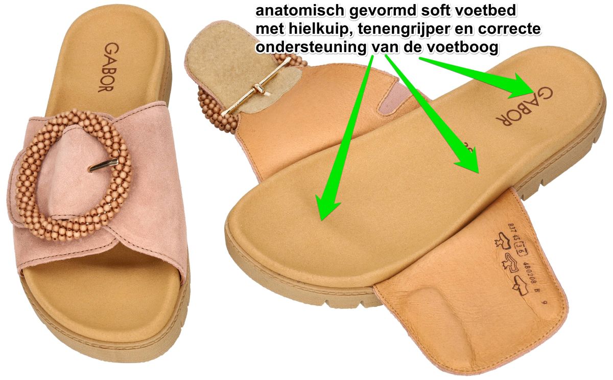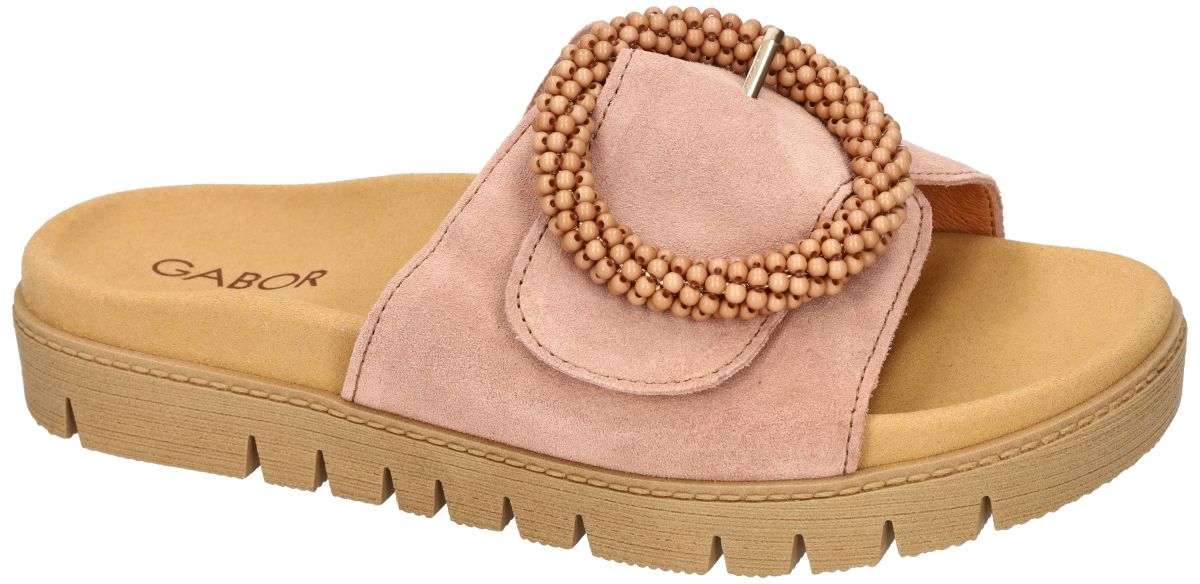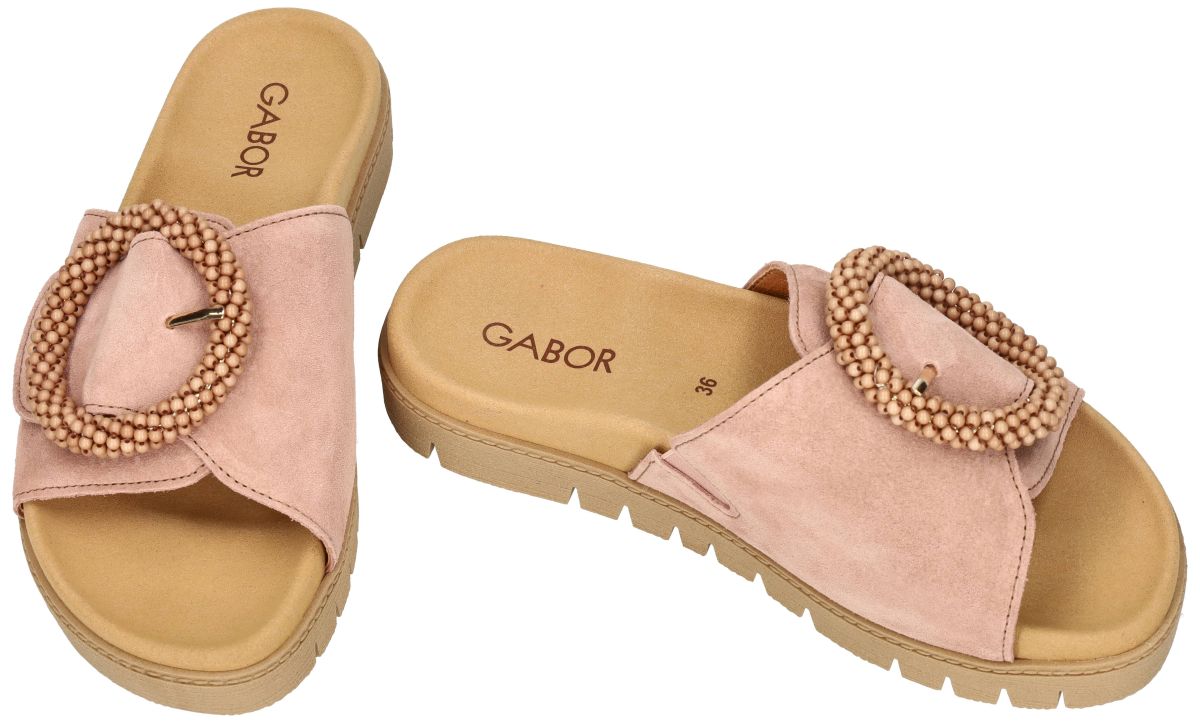 Gabor 83.745.11 Dreamvelour Clay zijn Modieuze slippers met anatomisch comfort. Deze stijlvolle damesslipper uit de nieuwe lente/zomer collectie van Gabor combineert eigentijdse elegantie met optimaal draagcomfort. Het model 83.745.11 in de uitvoering dreamvelour clay is uitgevoerd in een comfortabele F-wijdte leest, wat zorgt voor een ietwat smalle tot gemiddelde voetbreedte. De upper is vervaardigd uit fluweelzacht dreamvelour suède in een warme, poederige clay of oudroze tint. Deze subtiele zomerkleur geeft de slipper een vrouwelijke en verfijnde uitstraling. Blikvanger is de grote, decoratieve ronde gesp, afgewerkt met fijne kralenstructuur in ton-sur-ton kleur. Deze unieke gesp geeft het model een modieuze, bijna juweelachtige uitstraling. De gesp is enkel decoratief; de effectieve sluiting gebeurt via een brede klittenband onder de wreefband, waardoor de slipper perfect kan worden aangepast aan verschillende voettypes en wreefhoogtes. Dit zorgt voor een stabiele, persoonlijke pasvorm. Het comfortabele voetbed is anatomisch gevormd en voelt zacht en veerkrachtig aan. Een subtiele opstaande rand rond de voet voor extra stabiliteit. Een ondersteunende hielkuip houdt de voet op zijn plaats. Een lichte tenengrijper voor natuurlijke afwikkeling en onbewuste sprijding van de tenen. Gerichte ondersteuning onder de voetboog . Deze ergonomische opbouw bevordert een correcte houding en een aangename drukverdeling, ideaal voor lange zomerdagen. De upper staat op een flexibele plateauzool in een warme gum natuurkleur. De licht verhoogde zool geeft een moderne, casual uitstraling en zorgt tegelijk voor extra demping tijdens het stappen. Het geprofileerde loopvlak biedt voldoende grip en stabiliteit. Gabor 83.745.11 Dreamvelour Clay is een modieuze slipper in F-wijdte die zacht suède, een opvallend design en anatomisch comfort perfect samenbrengt. Een elegante en comfortabele must-have voor een stijlvolle zomer. Gabor comfort damesschoenen vindt men in onze schoenenwinkel regio Aalst, Ninove, Geraardsbergen, Zottegem, Liedekerke of kan men online bestellen op onze webshop.