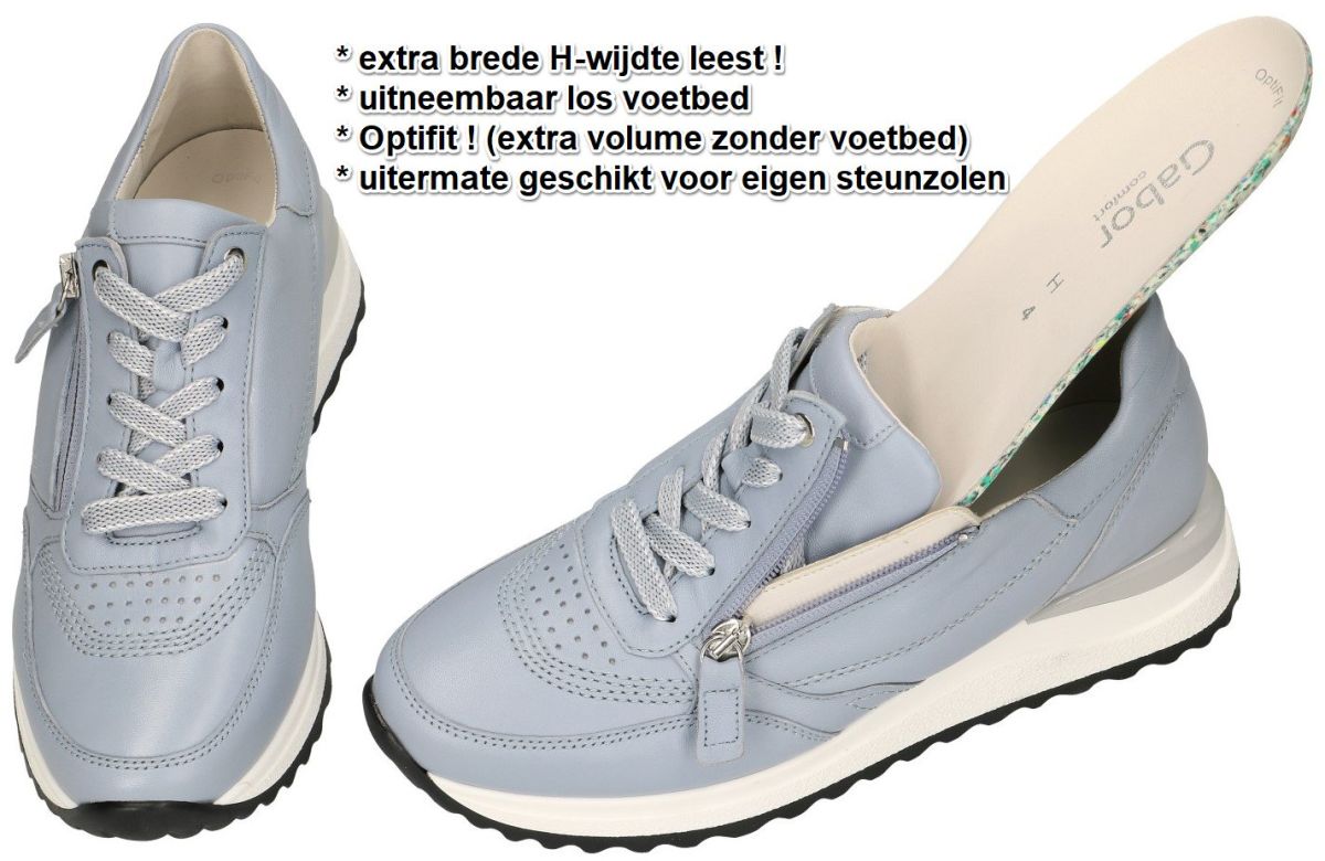 GABOR artikel/model 26.594.26 Chiffon sky wechselfußbett zijn licht blauwe (hemelsblauw of babyblauw) damesschoenen EXTRA BREDE plateauzool runners chunky sneakers of vrouwen sportschoenen uit de nieuwe lente/zomer 2023 collectie van het Duitse schoenenmerk en schoenenfabrikant Gabor. Deze sportieve Gabor sneakers hebben een extra brede H-wijdte leest speciaal voor vrouwen met brede en zware voeten. Deze sneakers zijn voorzien van een Optifit uitneembaar voetbed dat als het wordt weggenomen nog meer ruimte en volume vrijmaakt of om het plaatsen van uw eigen steunzolen. Deze unieke en aparte runners zijn uitgevoerd in licht blauw of hemelsblauw gladleder en dit op een chunky dikke witte plateauzool. Bovendien zijn deze comfortabele best fitting voorzien van zowel veters als een ritssluiting aan de buitenzijde zodat aan en uit trekken van deze sportschoenen super gemakkelijk gaat. De nieuwe Gabor sneakers collectie kan men kopen in onze schoenenwinkel regio Aalst, Ninove, Geraardsbergen, Zottegem, Liedekerke of online bestellen op onze webshop.