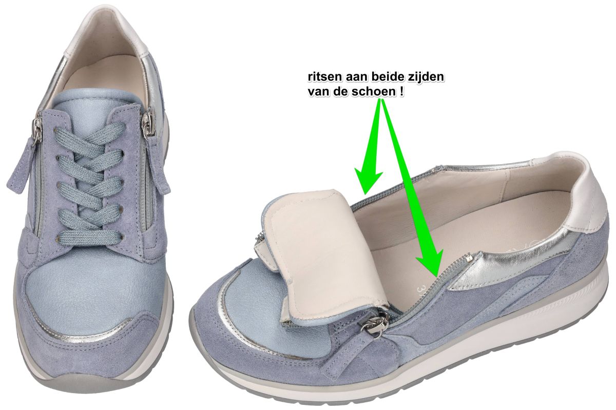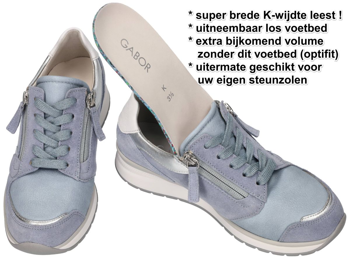 Ontdek de ultieme combinatie trendy sportief met orthopedisch hoogcomfort met deze nieuwe Gabor K-leest sneakers, model 86.307.64. Deze frisse jeansblauwe of hemelsblauwe sneakers of sportieve schoenen zijn niet alleen een lust voor het oog, maar bieden ook ongekend comfort voor uw voeten. Deze sneakers zijn uitgevoerd in een super brede K-wijdte leest, waardoor ze ideaal zijn voor zeer brede voeten of voor wie extra ruimte nodig heeft. Daarnaast is de binnenzool uitneembaar, waardoor nog meer extra volume kan worden vrijgemaakt of u eenvoudig uw eigen steunzolen kunt gebruiken voor een persoonlijke pasvorm. De schoenen zijn vervaardigd van hoogwaardige materialen, zacht velour nubuck en rekbaar stretchmateriaal en enkele turquois en zilver metallic details, wat zorgt voor een modieuze en luxueuze uitstraling. Voor extra gemak zijn de schoenen uitgerust met zowel veters als een ritssluiting aan beide zijden, waardoor ze makkelijk aan en uit te trekken zijn. Bijzonder aan dit model is de rekbaar stretch zone aan de hallux valgus, wat extra comfort biedt voor mensen met gevoelige voeten of een knobbel bij de grote teen. Deze veelzijdige schoenen zijn dus perfect voor lange dagen waarbij comfort voorop staat. Combineer ze met uw favoriete casual outfit voor een alledaagse look of draag ze onder een nette broek voor een stijlvolle touch aan uw werkensemble. Met de Gabor sneakers, model 86.307.64 jeans lagune/silber/weiss, loopt u er ook met zeer brede en volumineuze voeten toch modieus en comfortabel bij, elke dag weer. Gabor hoogcomfort schoenen vindt men in onze schoenenwinkel regio Aalst, Ninove, Geraardsbergen, Zottegem, Liedekerke of kan men online bestellen op onze webshop.