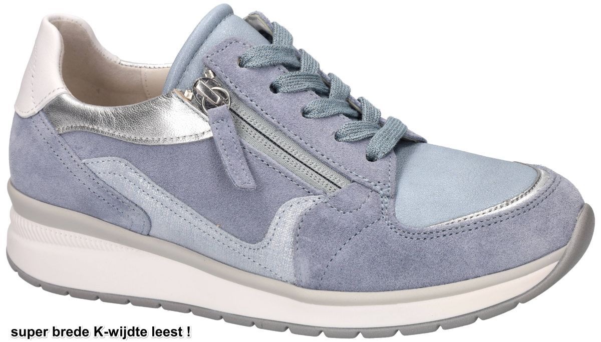 Ontdek de ultieme combinatie trendy sportief met orthopedisch hoogcomfort met deze nieuwe Gabor K-leest sneakers, model 86.307.64. Deze frisse jeansblauwe of hemelsblauwe sneakers of sportieve schoenen zijn niet alleen een lust voor het oog, maar bieden ook ongekend comfort voor uw voeten. Deze sneakers zijn uitgevoerd in een super brede K-wijdte leest, waardoor ze ideaal zijn voor zeer brede voeten of voor wie extra ruimte nodig heeft. Daarnaast is de binnenzool uitneembaar, waardoor nog meer extra volume kan worden vrijgemaakt of u eenvoudig uw eigen steunzolen kunt gebruiken voor een persoonlijke pasvorm. De schoenen zijn vervaardigd van hoogwaardige materialen, zacht velour nubuck en rekbaar stretchmateriaal en enkele turquois en zilver metallic details, wat zorgt voor een modieuze en luxueuze uitstraling. Voor extra gemak zijn de schoenen uitgerust met zowel veters als een ritssluiting aan beide zijden, waardoor ze makkelijk aan en uit te trekken zijn. Bijzonder aan dit model is de rekbaar stretch zone aan de hallux valgus, wat extra comfort biedt voor mensen met gevoelige voeten of een knobbel bij de grote teen. Deze veelzijdige schoenen zijn dus perfect voor lange dagen waarbij comfort voorop staat. Combineer ze met uw favoriete casual outfit voor een alledaagse look of draag ze onder een nette broek voor een stijlvolle touch aan uw werkensemble. Met de Gabor sneakers, model 86.307.64 jeans lagune/silber/weiss, loopt u er ook met zeer brede en volumineuze voeten toch modieus en comfortabel bij, elke dag weer. Gabor hoogcomfort schoenen vindt men in onze schoenenwinkel regio Aalst, Ninove, Geraardsbergen, Zottegem, Liedekerke of kan men online bestellen op onze webshop.