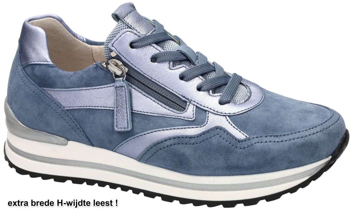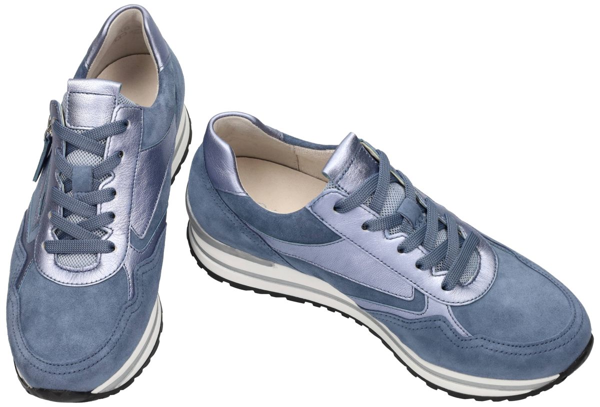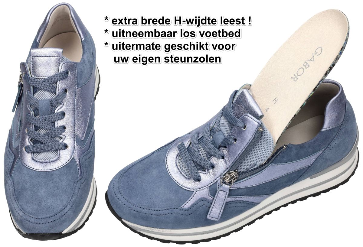Deze Gabor comfort sneakers uit de nieuwe lente/zomercollectie combineren een uitgesproken modieus design met doordachte orthopedische eigenschappen. Model 86.524.26 in de uitvoering Samtchevreau Heaven / Metallic Azur is speciaal ontworpen voor dames die nét dat beetje meer ruimte en ondersteuning nodig hebben, zonder in te boeten aan uitstraling. De extra brede H-wijdte leest biedt royaal plaats aan bredere of gevoelige voeten en zorgt voor een aangenaam, drukvrij draagcomfort. De sneaker is voorzien van een stugge afrolzool die niet plooibaar of torsbaar is – een eigenschap die door podologen en orthopedisten sterk wordt aanbevolen voor een stabiele en gezonde voetafwikkeling. Bovendien werkt deze zool schokabsorberend, wat de belasting op gewrichten en rug merkbaar vermindert tijdens het stappen. Binnenin bevindt zich een uitneembaar, los voetbed, waardoor deze Gabor sneaker perfect geschikt is voor het dragen van eigen steunzolen of orthopedische inlegzolen. Dankzij de combinatie van vetersluiting én functionele rits is aan- en uittrekken eenvoudig en kan de pasvorm nauwkeurig worden aangepast aan de voet. Het design is een echte blikvanger: zacht hemelsblauw suède (samtchevreau) wordt stijlvol gecombineerd met metallic turquoise azuurblauwe accenten, wat deze sneaker een frisse, luxueuze en eigentijdse uitstraling geeft. Subtiele metallic details aan de hiel en langs de zijkant versterken het modieuze karakter, terwijl de licht contrasterende zool het geheel een sportieve touch geeft. Kortom, deze extra brede Gabor sneakers 86.524.26 zijn de ideale keuze voor wie op zoek is naar hoog comfort, orthopedische ondersteuning en een opvallend elegant design. Perfect voor dagelijks gebruik, lange wandelingen of actieve dagen waarbij stijl en welzijn hand in hand gaan. De nieuwe Gabor sneakers collectie kan men kopen in onze schoenenwinkel regio Aalst, Ninove, Geraardsbergen, Zottegem, Liedekerke of online bestellen op onze webshop.