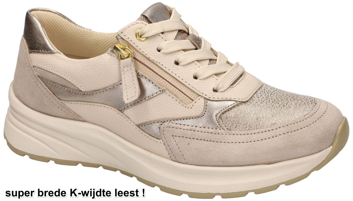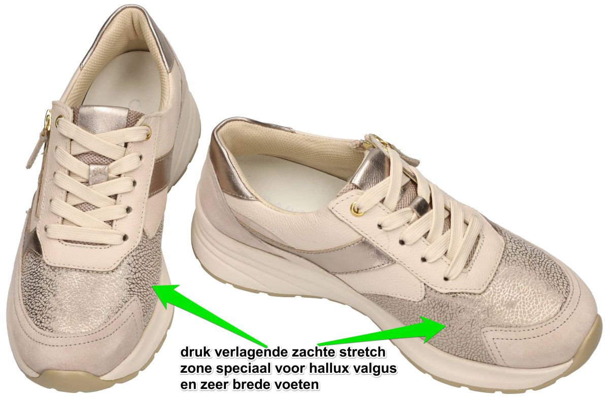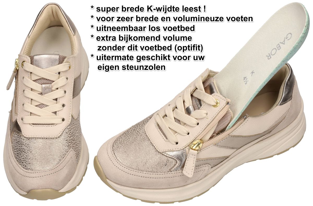 Deze stijlvolle en uiterst comfortabele damessneakers uit de nieuwe lente/zomercollectie van Gabor combineren een modieuze uitstraling met uitzonderlijk veel ruimte voor de voet. Model 86.597.34 in de uitvoering Oasi / Crème / Puder werd speciaal ontworpen voor dames die een extra brede en volumineuze voet hebben, maar toch een trendy sneaker willen dragen. De schoen is uitgevoerd op een super brede K-wijdte leest, waardoor hij uitzonderlijk veel ruimte biedt aan de voorvoet en de wreef. Dit maakt dit model ideaal voor vrouwen met zeer brede voeten of een grotere voetomtrek. Extra comfort wordt geboden door een drukverlagende zachte stretchzone aan de voorvoet, die speciaal geplaatst is ter hoogte van de hallux valgus zone. Het rekbare materiaal past zich soepel aan de voet aan en vermindert drukpunten, waardoor gevoelige voeten maximaal ontlast worden. Binnenin beschikt deze sneaker over het Gabor Optifit systeem met een uitneembaar voetbed. Hierdoor kan het standaard voetbed eenvoudig vervangen worden door persoonlijke orthopedische steunzolen, terwijl zonder voetbed extra bijkomend volume in de schoen ontstaat. Het ontwerp van deze sneaker oogt modern en elegant met een zachte kleurencombinatie van crème, beige en poederkleurige tinten. De voorvoet is uitgevoerd in een subtiel metallic craquelé leder dat een verfijnde glans geeft, terwijl het omliggende bovenwerk bestaat uit zacht suède en soepel generfd leder in warme zand- en crème tinten. Metallic accenten in champagnekleur langs de zijpanelen en hiel zorgen voor een luxueuze uitstraling. De sneaker is uitgerust met een combinatie van veters en een praktische ritssluiting aan de zijkant. De veters zorgen voor een optimale pasvorm, terwijl de rits het aan- en uittrekken bijzonder gemakkelijk maakt. Onder de schoen bevindt zich een sportieve chunky zool met een lichtgewicht, schokdempende constructie. Deze modieuze dikke zool geeft de sneaker een eigentijdse uitstraling en zorgt tegelijk voor uitstekende demping en loopcomfort. Dankzij de combinatie van modieus design, hoogwaardige materialen en uitzonderlijk veel ruimte is deze Gabor sneaker een ideale keuze voor dames die comfort, ondersteuning en stijl willen verenigen in één schoen. Een trendy comfort sneaker die bewijst dat ook dames met zeer brede voeten kunnen genieten van een modieuze en elegante uitstraling. Gabor hoogcomfort schoenen vindt men in onze schoenenwinkel regio Aalst, Ninove, Geraardsbergen, Zottegem, Liedekerke of kan men online bestellen op onze webshop.