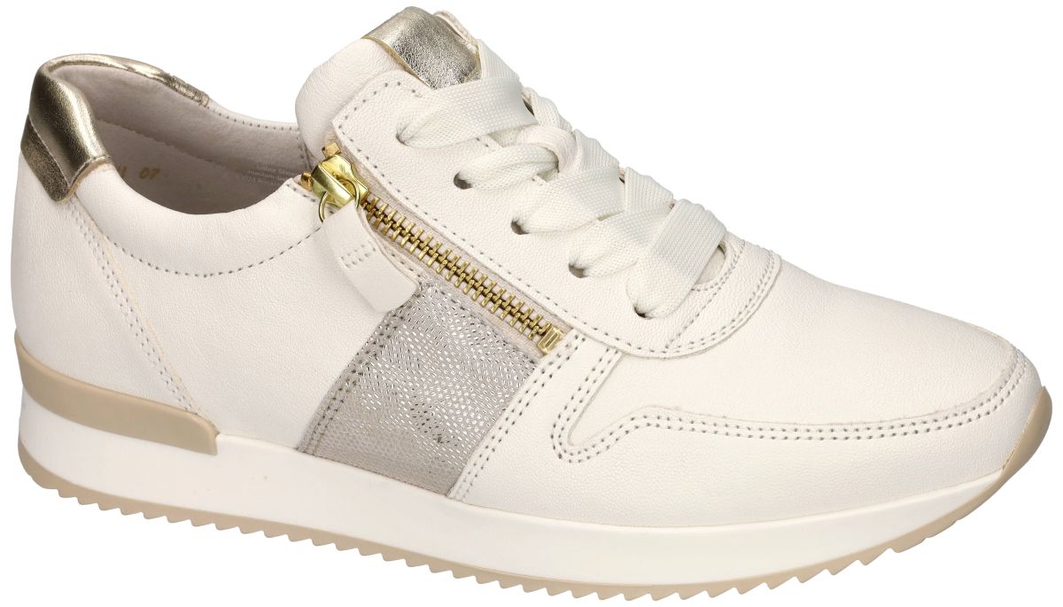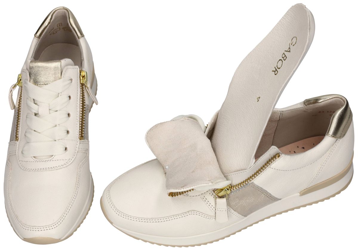 Gabor 83.420.20 Nappa/Leo/Metallic latte/platino dames sneakers – Stijlvol comfort uit de Gabor Best Fitting-lijn. Maak kennis met de Gabor 83.420.20 sneakers, een stijlvolle en comfortabele keuze uit de Best Fitting-lijn van Gabor. Deze offwhite crème leren sneakers zijn perfect voor de lente en zomer en bieden een modieus design met een praktische pasvorm. Deze Gabor 83.420.20 vrouwen sneakers hebben een crème of ivoorkleurig gladleder bovenwerk met gouden en zilver metallic zones op de hiel, tong en zijkanten. Deze subtiele details geven deze sportieve veterschoenen een klasse luxueuze uitstraling. De goudkleurige ritsen aan beide zijden maken het niet alleen een opvallend mode-item, maar zorgen ook voor extra gebruiksgemak bij het aan- en uittrekken. Optimale pasvorm en loopcomfort. Deze sneakers behoren tot de Best Fitting-lijn van Gabor, wat betekent dat ze bij de bal van de voet net iets meer ruimte bieden voor een aangenaam draagcomfort. Het uitneembare voetbed maakt ze geschikt voor eigen inlegzolen, terwijl de flexibele zool zorgt voor optimale demping en grip. Dankzij het stijlvolle crème leer en de subtiele metallic details passen deze Gabor 83.420.20 sneakers perfect bij casual outfits zoals jeans en shorts, maar ook bij een luchtige zomerjurk voor een sportieve touch. Maak je voorjaarsgarderobe compleet met deze modieuze en comfortabele sneakers! De nieuwe Gabor sneakers collectie kan men kopen in onze schoenenwinkel regio Aalst, Ninove, Geraardsbergen, Zottegem, Liedekerke of online bestellen op onze webshop.