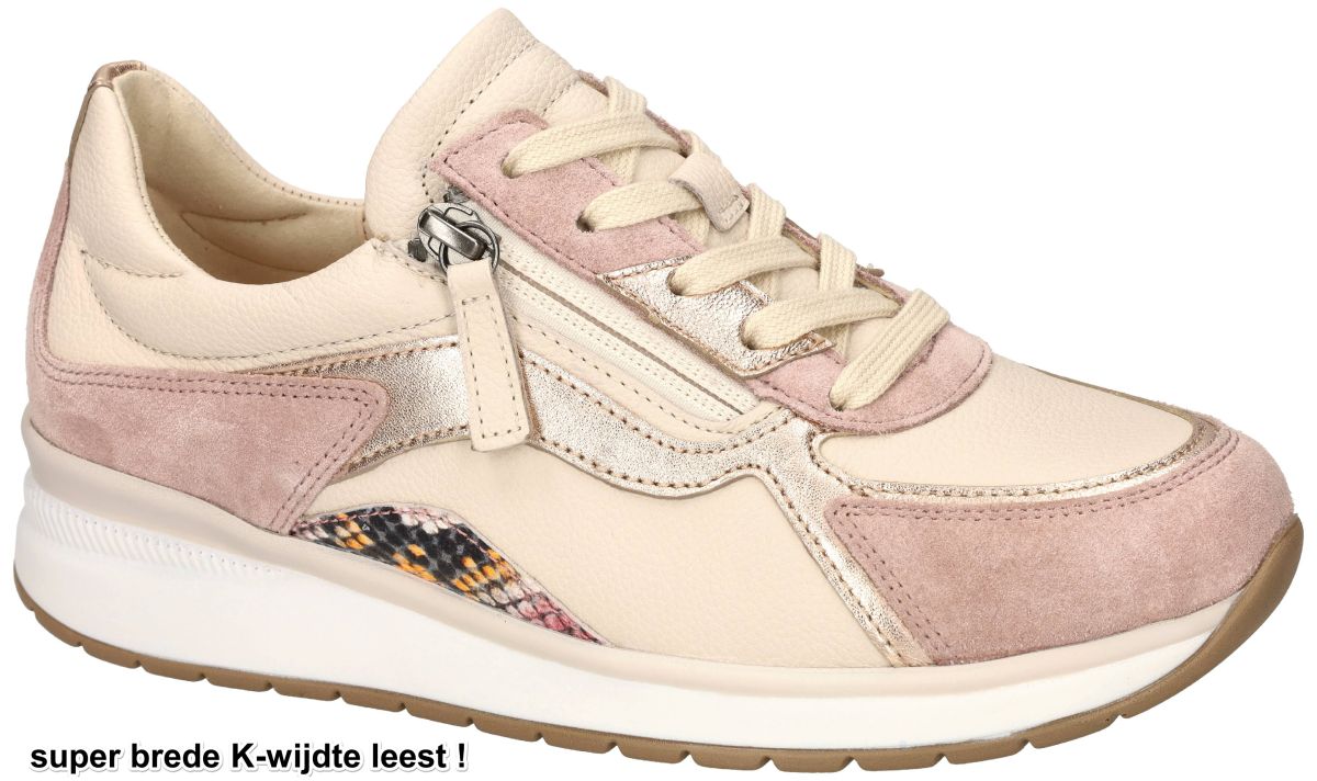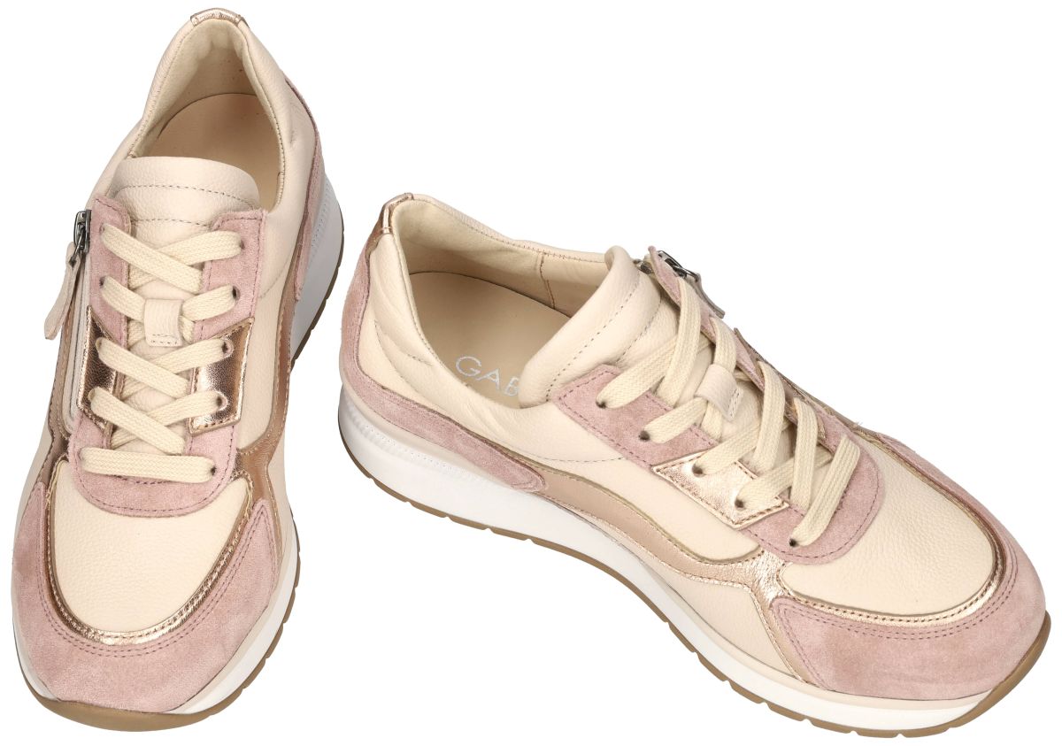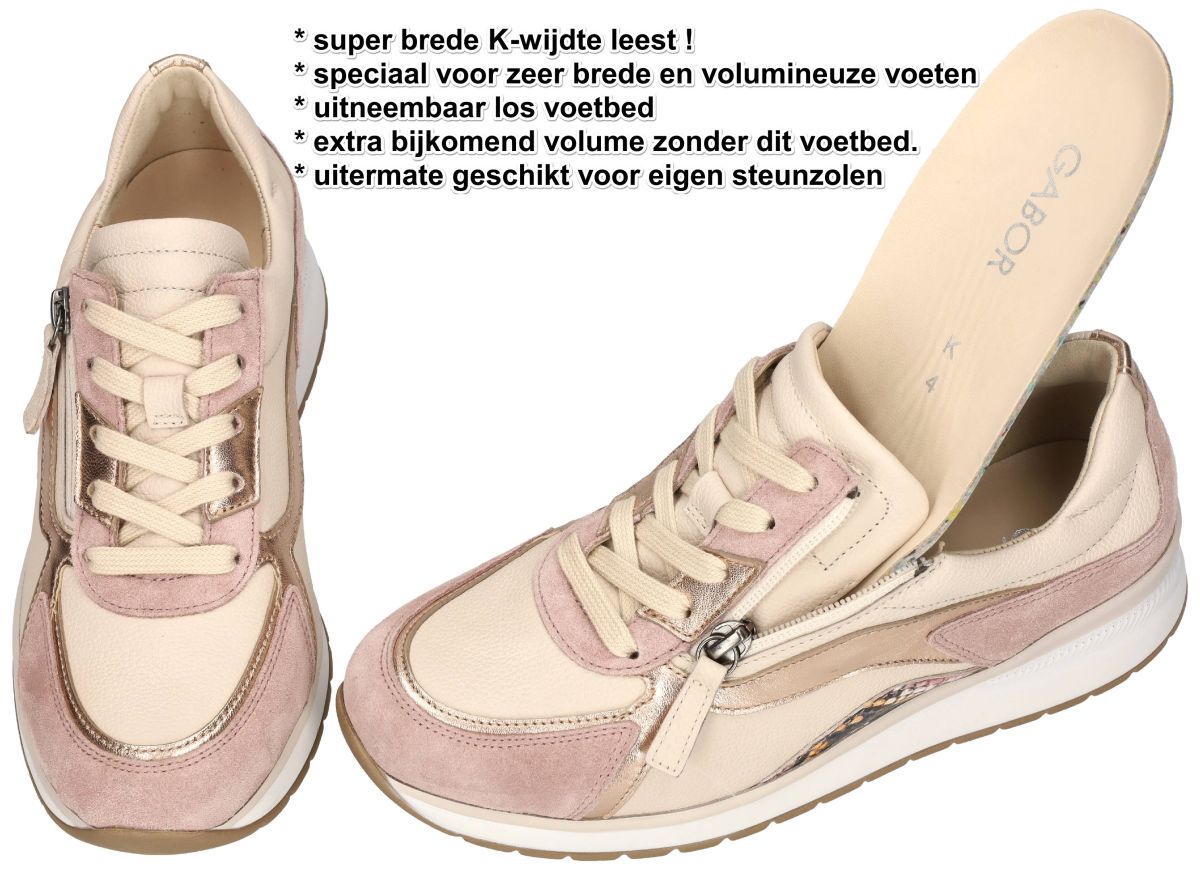 Til je dagelijkse stijl naar een hoger niveau met deze Gabor 86.305.52 sneakers, in de uitvoering Cervo/Velour/Metallic creme/rose kombi de perfecte combinatie van modern design en optimaal comfort voor dames met brede en volumineuze voeten. Deze trendy sneakers met een super brede K-wijdte leest zijn speciaal vervaardigd om stijl te koppelen aan comfort voor wie meer ruimte en een perfecte pasvorm waardeert. Deze modieuze Gabor sneakers benadrukken niet alleen stijl maar ook functionaliteit. Ze zijn voorzien van het innovatieve Optifit-systeem met een los uitneembaar voetbed. Dit slimme ontwerp biedt de mogelijkheid om extra ruimte te creëren voor je voeten of om het voetbed te vervangen door eigen steunzolen, zonder in te boeten aan de elegante uitstraling. Het zachte, ademende lederen binnenwerk verzekert langdurig comfort en een luxe gevoel, terwijl de zachte pasteltinten en de subtiele mix van leer en suède een statement maken in elke setting. De ritsdetailering voegt een praktisch en tegelijkertijd modieus element toe, waardoor je deze schoenen snel en gemakkelijk kunt aantrekken. Of je nu door de stad loopt of geniet van een ontspannen dag, deze Gabor sneakers zijn jouw ideale partner. Ze combineren gemakkelijk met verschillende outfits, van casual jeans tot meer geklede opties. Laat de wereld zien dat breedte niet ten koste hoeft te gaan van stijl met deze Gabor sneakers die een onmisbaar item in je garderobe zullen worden. Gabor hoogcomfort schoenen vindt men in onze schoenenwinkel regio Aalst, Ninove, Geraardsbergen, Zottegem, Liedekerke of kan men online bestellen op onze webshop.