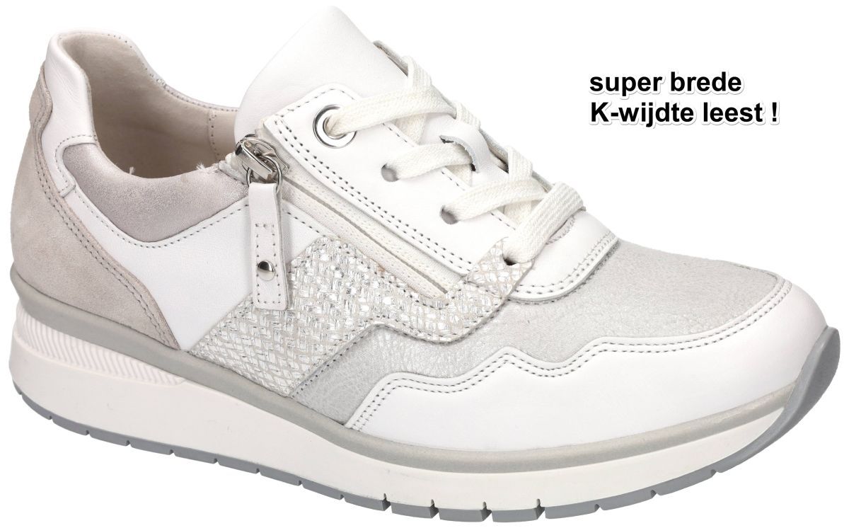 Gabor K-wijdte sneakers 66.306.61 Stretch/Nappa/Metallic bianco/weiss/ice. Ontdek de ultieme combinatie trendy sportief met orthopedisch hoogcomfort met deze nieuwe Gabor K-leest sneakers, model 66.306.61. Deze trendy wit/zilver sneakers of sportieve schoenen zijn niet alleen een lust voor het oog, maar bieden ook ongekend comfort voor uw voeten. Deze sneakers zijn uitgevoerd in een super brede K-wijdte leest, waardoor ze ideaal zijn voor zeer brede voeten of voor wie extra ruimte nodig heeft. Daarnaast is de binnenzool uitneembaar, waardoor nog meer extra volume kan worden vrijgemaakt of u eenvoudig uw eigen steunzolen kunt gebruiken voor een persoonlijke pasvorm. De schoenen zijn vervaardigd met hoogkwalitatieve leders, wit gladleer gecombineerd met zilver metallic snake-print en ijs-grijs gecraqueleerd stretchmateriaal, wat zorgt voor een modieuze en luxueuze uitstraling. De metallic afwerking geeft een subtiele glans die bij elke stap opvalt. Voor extra gemak zijn de schoenen uitgerust met zowel veters als een ritssluiting, waardoor ze makkelijk aan en uit te trekken zijn. Bijzonder aan dit model is de rekbaar stretch zone aan de hallux valgus, wat extra comfort biedt voor mensen met gevoelige voeten of een knobbel bij de grote teen. Deze veelzijdige schoenen zijn dus perfect voor lange dagen waarbij comfort voorop staat. Combineer ze met uw favoriete casual outfit voor een alledaagse look of draag ze onder een nette broek voor een stijlvolle touch aan uw werkensemble. Met de Gabor sneakers, model 66.306.62, loopt u er ook met zeer brede en volumineuze voeten toch modieus en comfortabel bij, elke dag weer. Gabor hoogcomfort schoenen vindt men in onze schoenenwinkel regio Aalst, Ninove, Geraardsbergen, Zottegem, Liedekerke of kan men online bestellen op onze webshop.