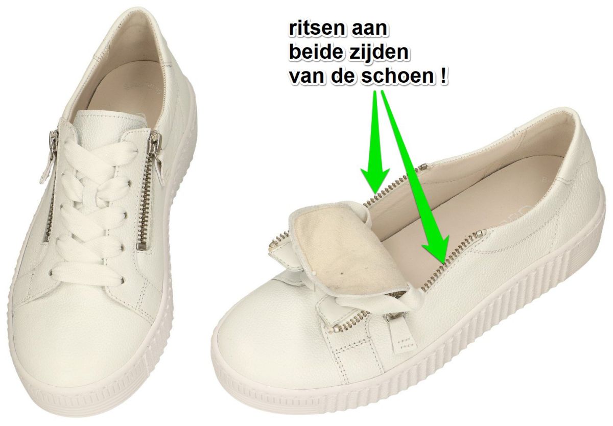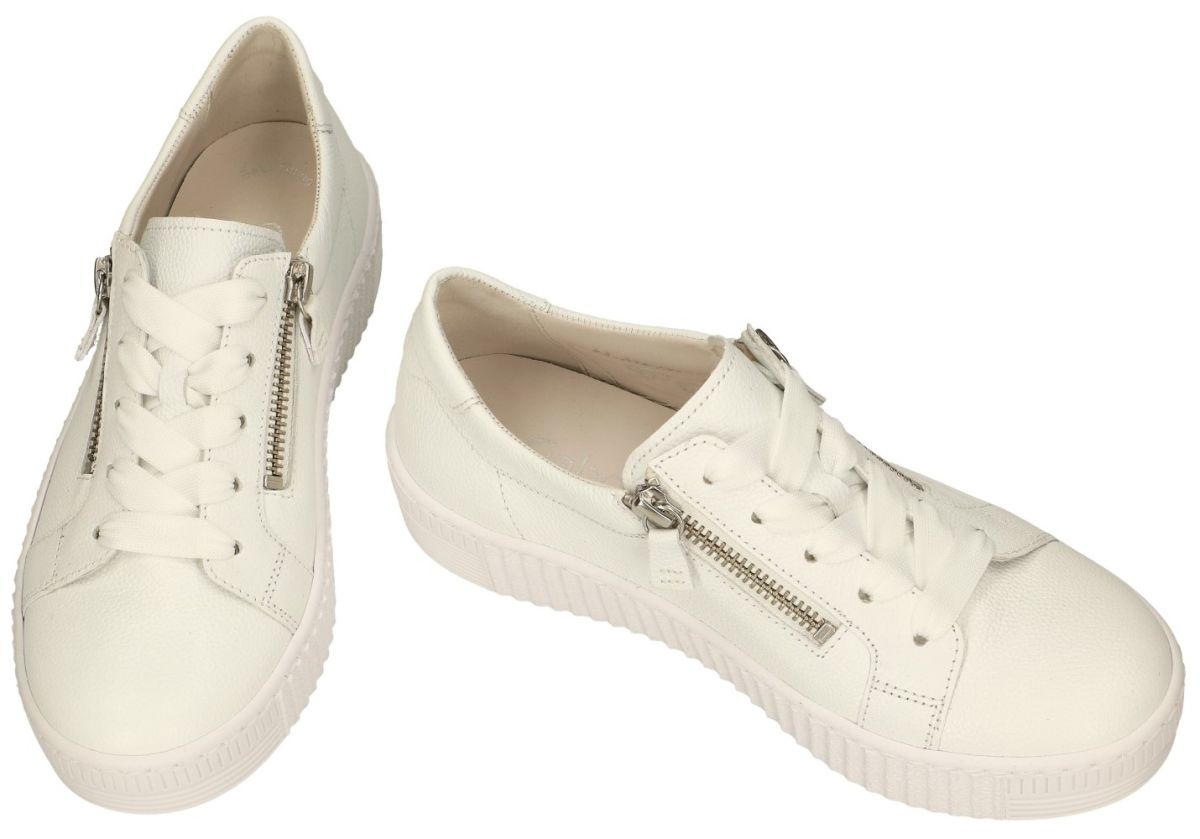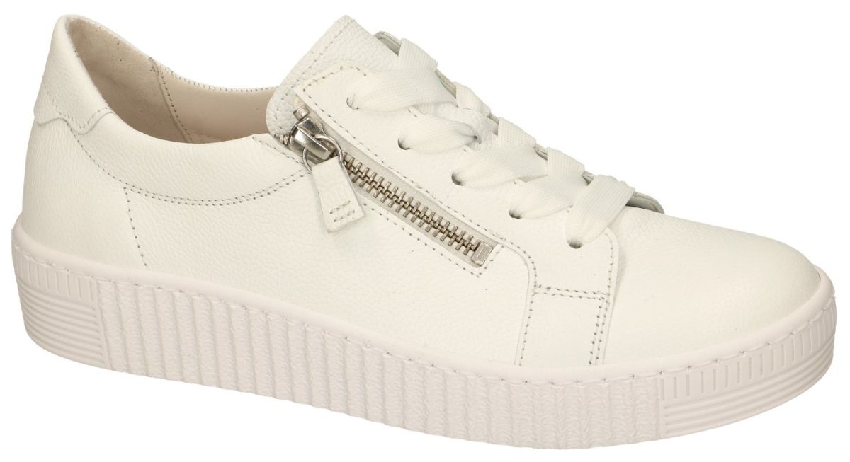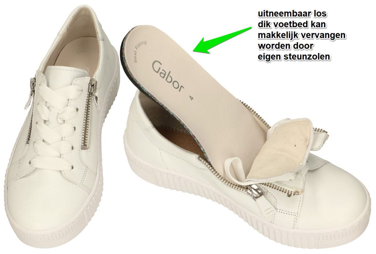 GABOR artikel/model 83.334.21 cervo weiss (ice) wechselfußbett zijn witte lederen damesschoenen sneakers of sportieve gympen of baskets uit de nieuwe lente/zomer 2026 collectie van het bekende Duitse schoenenmerk en schoenenproducent Gabor. Deze casual chic Gabor plateauzool sneaker staat op een 3 cm dikke witte geribte kuipzool en de upper is uitgevoerd in een sneeuwwit generfd leder met brede witte veterlinten. Deze comfortabele best fitting Gabor sneaker is voorzien van twee ritsen aan beide zijden van de schoen en heeft een gemiddelde tot ietwat smalle F-wijdte leest en is voorzien van een dik los voetbed dat kan weggenomen worden om extra breedte en volume te maken voor de wat zwaardere voeten of om plaats te maken voor eigen steunzolen. Veel sneaker voor een budgetvriendelijke prijs ! De nieuwste Gabor sneakers kan men kopen in onze schoenenwinkel regio Aalst, Ninove, Geraardsbergen, Liedekerke, Zottegem of online bestellen op onze webshop.