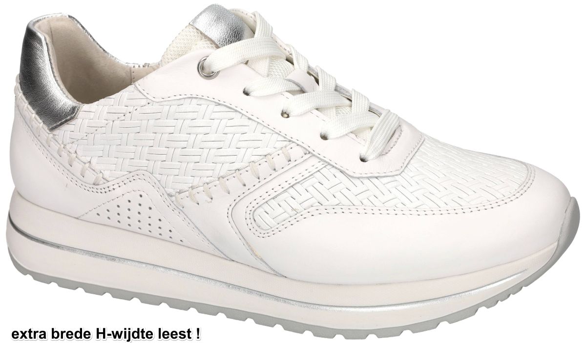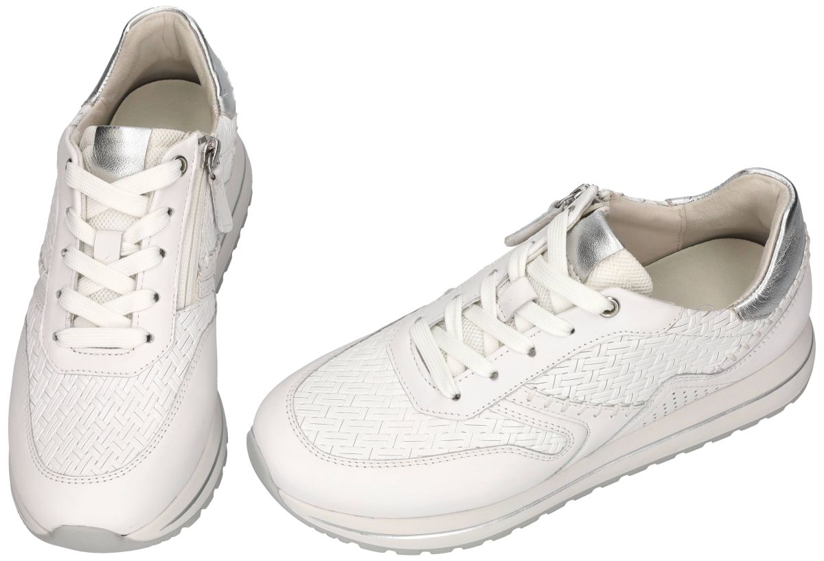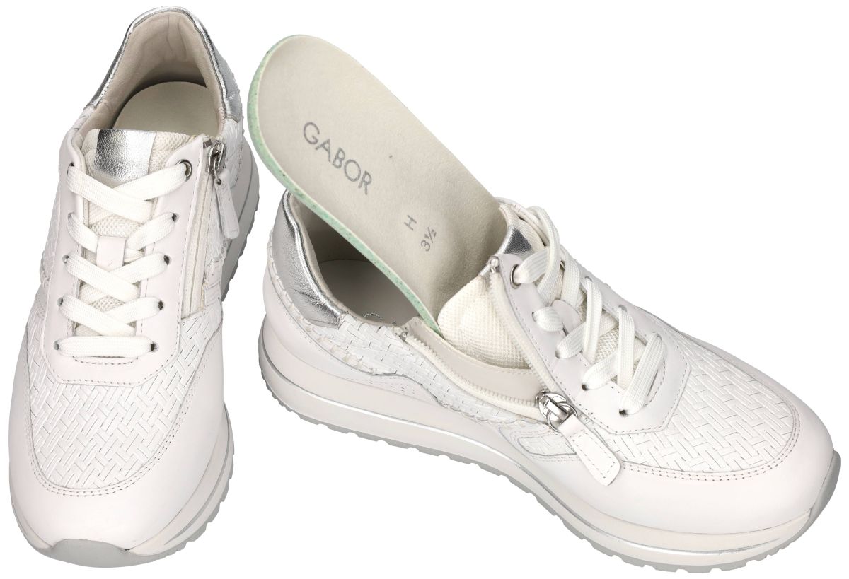 Gabor 86.336.50 – Twist/Nappa/Perlato Weiss/Silber | Comfortabele witte damessneakers in H-wijdte. Een stijlvolle witte sneaker mag niet ontbreken in de schoenenkast van een moderne vrouw. Deze Gabor damessneaker 86.336.50 uit de nieuwe lente/zomercollectie combineert tijdloze elegantie met hoogwaardig comfort en een extra brede pasvorm. De uitvoering Twist/Nappa/Perlato weiss/silber straalt verfijning uit tot in het kleinste detail. Het bovenwerk is vervaardigd uit een harmonieuze combinatie van wit gladleder dat wordt samengebracht met een wit tressé of vlechtwerkprint. Dit subtiele geweven motief geeft de sneaker een luxueuze, zomerse uitstraling zonder in te boeten aan veelzijdigheid. De zilver metallic accenten op de tong en het contrefort zorgen voor een moderne, frisse toets en versterken het modieuze karakter van deze sneaker. Deze Gabor sneaker is uitgevoerd op een extra brede H-wijdte leest, ideaal voor dames met een bredere voet of voor wie extra comfort wenst. Binnenin geniet u van een volledig lederen binnenbekleding, wat bijdraagt aan een aangenaam voetklimaat en extra draagcomfort. Het uitneembare voetbed maakt het mogelijk om eigen steunzolen te dragen, terwijl het standaard voetbed reeds optimale ondersteuning biedt. De sneaker is bovendien ultra lichtgewicht, waardoor hij moeiteloos de hele dag gedragen kan worden. De stuggere loopzool biedt stabiliteit en ondersteuning tijdens het stappen en wordt vaak aanbevolen door orthopedisten en podologen. Deze stevige, licht verhoogde zool bevordert een gezonde houding en zorgt voor extra demping zonder aan flexibiliteit in te boeten. De subtiele zilverkleurige rand in de zoolafwerking geeft het geheel een elegante finishing touch. Naast de klassieke vetersluiting is deze sneaker voorzien van een praktische ritssluiting aan de zijkant, waardoor u de schoenen snel en eenvoudig kunt aan- en uittrekken zonder telkens opnieuw te moeten veteren. Gabor 86.336.50 weiss/silber is de perfecte combinatie van comfort, ondersteuning en tijdloze klasse. Een veelzijdige witte damessneaker die zowel sportief als gekleed gedragen kan worden – een onmisbare basic met een verfijnde twist voor het nieuwe seizoen. De nieuwe Gabor sneakers collectie vindt men in onze schoenenwinkel regio Aalst, Ninove, Geraardsbergen, Zottegem, Liedekerke of kan men online bestellen op onze webshop.