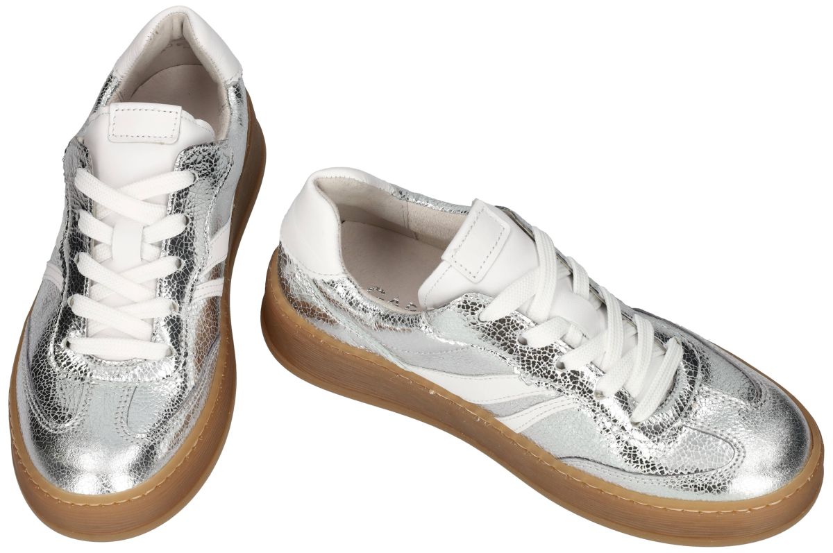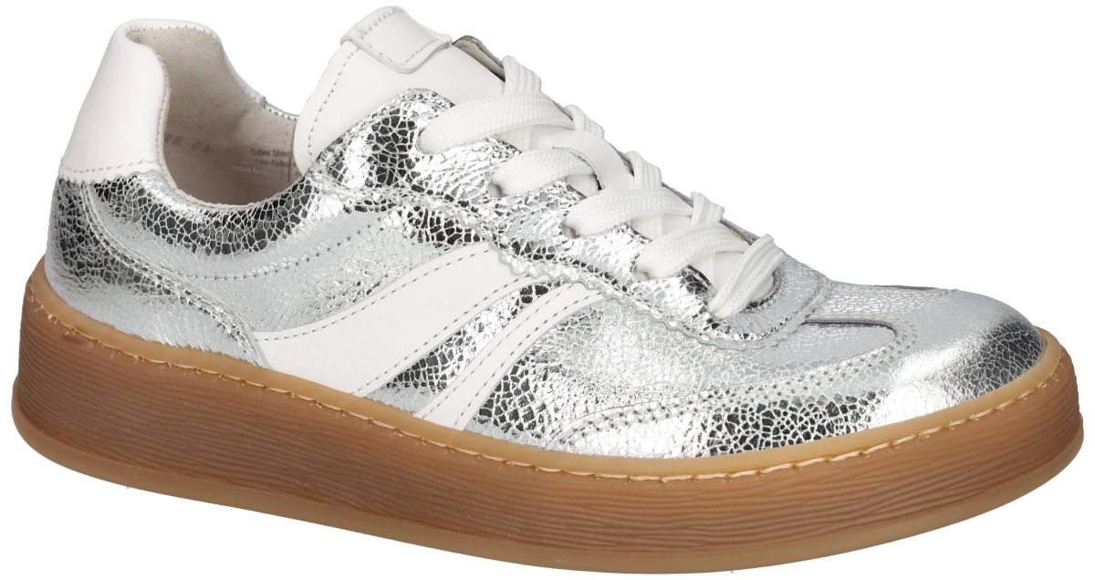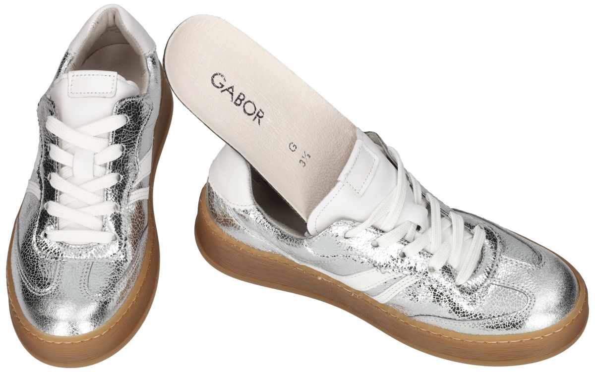 Gabor dames sneaker 86.475.60 in Mini Crack/Nappa argento/weiss . Deze modieuze dames sneaker van Gabor combineert een opvallend metallic design met het gekende comfort van het Duitse merk. Dankzij de lichte materialen, frisse kleuren en sportieve uitstraling past dit model perfect binnen de lente/zomercollectie. De G-wijdte geeft de voet daarbij iets meer ruimte zonder in te leveren op elegantie. Het bovenwerk is uitgevoerd in de door de fabrikant opgegeven kleurstelling Mini Crack/Nappa argento/weiss: een mix van zilverkleurig metallic leer met crackle-effect, gecombineerd met glad wit nappaleer aan de hiel, tong en zijkant. De ronde neus en de dynamische belijning zorgen voor een frisse, moderne look die zich makkelijk laat stylen. Binnenin is de sneaker afgewerkt met een zacht textiel voering die luchtig aanvoelt en prettig draagt, ook op warmere dagen. Het uitneembare voetbed, bekleed met een leder toplaag, kan eenvoudig worden vervangen door eigen steunzolen. De pasvorm is gebaseerd op een comfortabele G-wijdte, ideaal voor gemiddelde tot licht bredere voeten. De lage instap en het soepele bovenwerk zorgen voor een vlotte instap en een aangenaam omsloten gevoel. De vetersluiting maakt het mogelijk om de wreef perfect af te stellen. De zacht gevoerde tong en kraag bieden extra comfort tijdens het wandelen. De lichtgewicht gumzool in naturel tint zorgt voor schokdemping en een betrouwbare grip. De subtiele platformuitstraling geeft de sneaker een trendy accent zonder te zwaar te ogen. Deze sneaker is ideaal voor dagelijks gebruik, stadswandelingen en casual outfits. Combineer met jeans, lichte tinten of zomerse jurken voor een frisse en modieuze voorjaarslook. De nieuwste Gabor sneakers vindt men in onze schoenenwinkel regio Aalst, Ninove of bestel online op onze webshop. Is uw maat net niet op voorraad? contacteer ons dan bestellen we die voor jou. Mogelijk van maat 35 tot maat 44 halve maten inclusief.