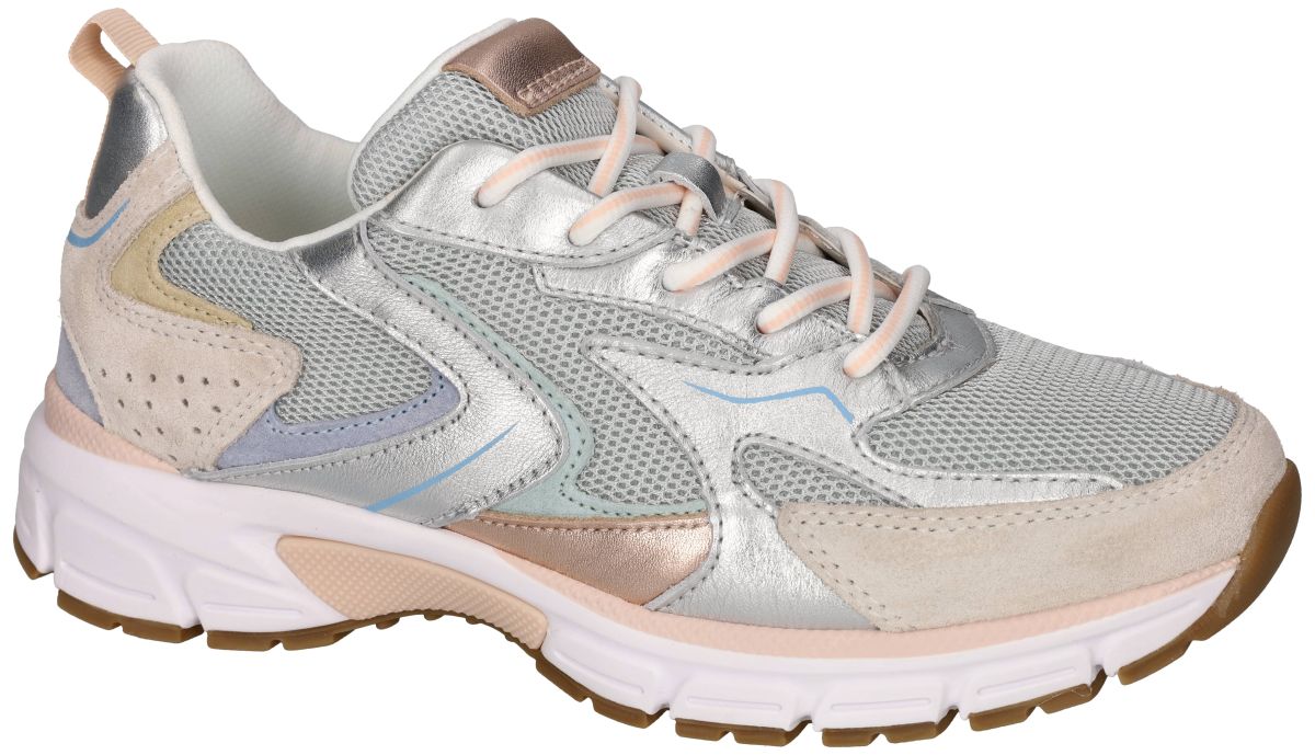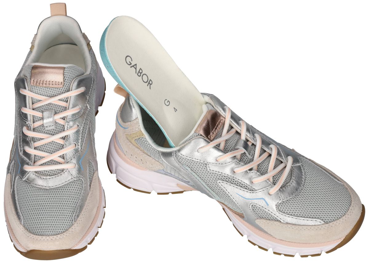Trek alle aandacht met de unieke en zeldzame Gabor trainer sneakers, waarbij de hedendaagse liefde voor chunky zolen samensmelt met een opvallend design bovenwerk dat creativiteit uitstraalt door de samenvoeging van diverse materialen en een palet van zilver en pastel kleuren. Deze modieuze chunky sneakers zijn een echte eye-catcher, dankzij de gedurfde maar geslaagde combinering van verschillende materialen zoals nubuck, mesh en metallics . Deze zachte pastelkleuren roze, geel, blauw lichtgrijs op een zilver metallic basis geven een eigentijdse twist aan deze fashion sneaker en weerspiegelen een jeugdige en sportieve esthetiek die past bij de actieve vrouw van vandaag. De ruime G-wijdte leest biedt voldoende ruimte voor gemiddeld tot ietwat bredere voeten, terwijl de gelaagde materialen een dynamische textuur en diepte toevoegen aan het ontwerp. De chunky zool is niet alleen trendy, maar ook functioneel, waardoor elke stap wordt gedempt en ondersteund, perfect voor dagen waarop u non-stop onderweg bent. Combineer deze sneakers met uw favoriete dagelijkse outfits voor een moeiteloze, maar opvallende look. Ervaar de perfecte combinatie van mode en functionaliteit met de Gabor Comfort sneakers, en loop voorop in de trend van comfortabele, maar stijlvolle schoenen die ontworpen zijn om op te vallen. Deze sneakers zijn meer dan een toevoeging aan uw garderobe; ze zijn een ode aan de moderne vrouw die weet dat een goede schoen de basis is van elke krachtige look. De nieuwe Gabor sneakers collectie kan men kopen in onze schoenenwinkel regio Aalst, Ninove, Geraardsbergen, Zottegem, Liedekerke of online bestellen op onze webshop.
