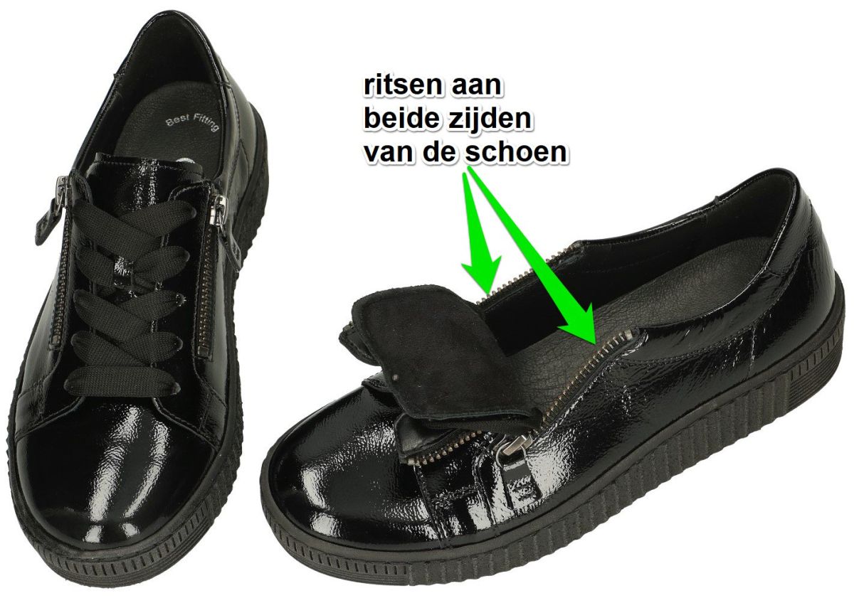 GABOR artikel/model 73.334.97 knautschlack schwarz wechselfußbett zijn zwart lak-lederen damesschoenen sneakers of sportieve gympen of baskets uit de nieuwe herfst/winter 2025 collectie van het bekende Duitse schoenenmerk en schoenenproducent Gabor. Deze casual chic Gabor plateauzool sneaker staat op een 3 cm dikke witte geribte kuipzool en de upper is uitgevoerd in een glanzend zwart soepel kreukellak met brede zwarte veterlinten. Deze comfortabele best fitting Gabor sneaker is voorzien van twee ritsen aan beide zijden van de schoen en heeft een gemiddelde tot ietwat smalle F-wijdte leest en is voorzien van een dik los voetbed dat kan weggenomen worden om extra breedte en volume te maken voor de wat zwaardere voeten of om plaats te maken voor eigen steunzolen. Veel sneaker voor een democratische prijs ! De nieuwste Gabor sneakers kan men kopen in onze schoenenwinkel regio Aalst, Ninove, Geraardsbergen, Liedekerke, Zottegem of online bestellen op onze webshop.