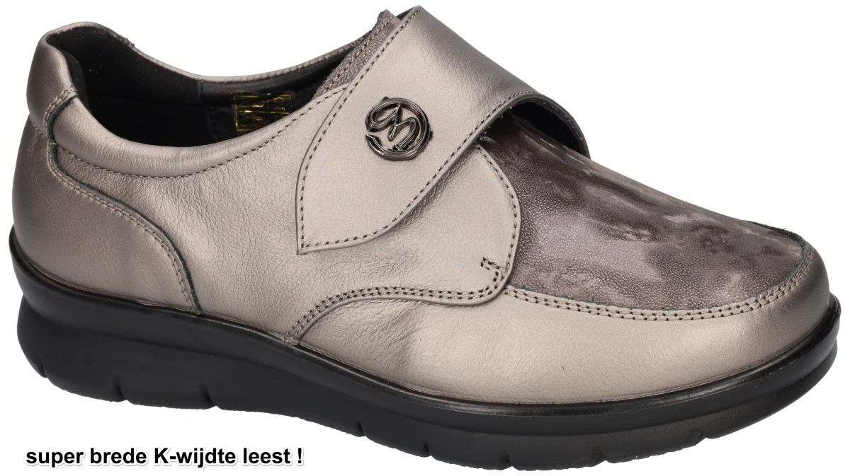 G-COMFORT by Grünwald schuhe artikel P-8261ZF Zinn Fantasy anthracite zijn brons metallic super brede orthopedische en podologische comfort damesschoenen meerbepaald sportieve instapschoenen of bandschoenen of klittenband sneakers van het Duitse schoenenbedrijf Glückschuh. Deze orthopedische/hoogcomfort vrouwenschoenen hebben een extra brede K-wijdte leest en zijn door de klittenbandsluiting (velcro) zeer makkelijk om aan te trekken en uit te stappen. Deze comfortabele vrouwenschoenen zijn uitgevoerd in een brons metallic leder gecombineerd met een een satijnachtige brons fantasieprint op de bovenplateau en het binnenwerk is zonder drukkende naden gemaakt uit zachte leder materialen. Het los uitneembaar voetbed kan zo nodig vervangen worden door eigen steunzolen. Voor vrouwen met wat bredere voeten, gezwollen voeten, hallux valgus enz of gewoon voor dames die comfort op de eerste plaats zetten. Top kwaliteit aan een zeer democratische prijs! G-comfort by Grünwald schoenen vindt men in onze schoenenwinkel regio Aalst, Ninove, Geraardsbergen, Zottegem, Liedekerke of kan men online bestellen op onze webshop.