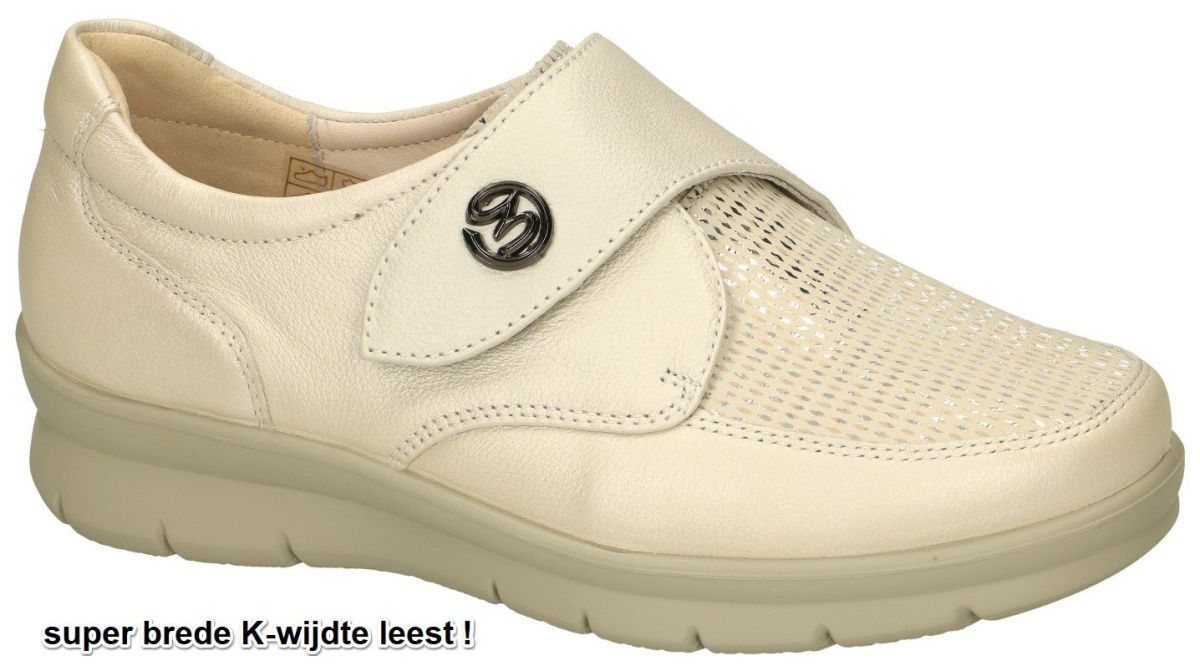 G-COMFORT by Grünwald schuhe artikel P-8261 weiss perlato zijn crème-beige super brede orthopedische en podologische comfort damesschoenen meerbepaald sportieve instapschoenen of bandschoenen of klittenband sneakers van het Duitse schoenenbedrijf Glückschuh. Deze orthopedische/hoogcomfort vrouwenschoenen hebben een extra brede K-wijdte leest en zijn door de klittenbandsluiting (velcro) zeer makkelijk om aan te trekken en uit te stappen. Deze comfortabele vrouwenschoenen zijn uitgevoerd in een parelmoer-wit of crème-wit satijnglanzend gecombineerd met een glinsterende nubuck met fantasieprint en het binnenwerk is zonder drukkende naden gemaakt uit zachte leder materialen. Het los uitneembaar voetbed kan zo nodig vervangen worden door eigen steunzolen. Voor vrouwen met wat bredere voeten, gezwollen voeten, hallux valgus enz of gewoon voor dames die comfort op de eerste plaats zetten. Top kwaliteit aan een zeer democratische prijs! G-comfort by Grünwald schoenen vindt men in onze schoenenwinkel regio Aalst, Ninove, Geraardsbergen, Zottegem, Liedekerke of kan men online bestellen op onze webshop.