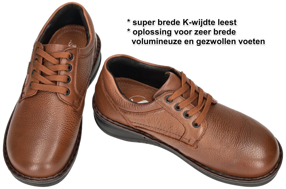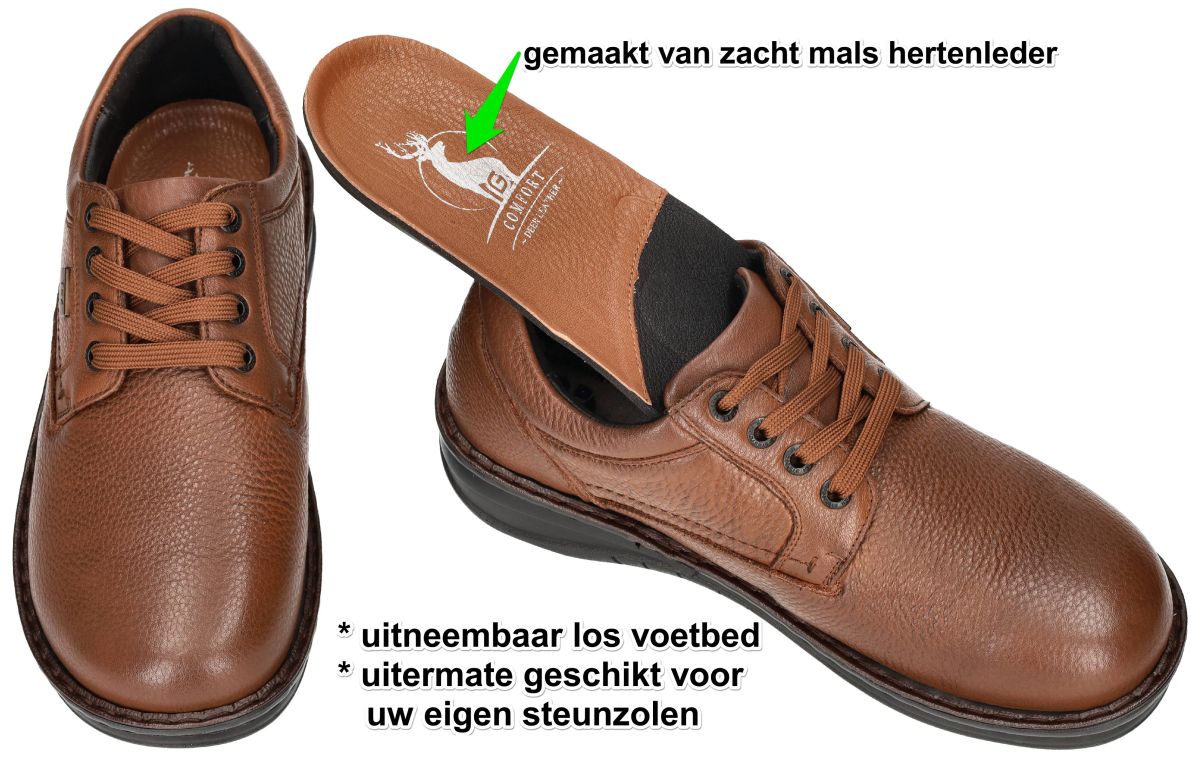 G-COMFORT by Grünwald schuhe artikel P-3701C zijn cognac bruin lederen super brede herenschoenen orthopedisch lage veterschoenen van het Duitse schoenenbedrijf Glückschuh. Deze hoogcomfort mannenschoenen hebben een super brede K-wijdte leest en derby vetersluiting. Deze comfortabele herenschoenen zijn speciaal ontworpen voor mannen met zeer brede, zware of gezwollen voeten. Deze mannenschoenen zijn vervaardigd uit soepel en rekbaar hertenleder en het binnenwerk is zonder drukkende naden gemaakt uit zachte materialen. De loopzool is schokabsorberend en voorzien om groot gewicht te dragen. Eindelijk schoenen waar uw voeten wel in passen! Het los uitneembaar voetbed kan zo nodig vervangen worden door eigen steunzolen. G-comfort by Grünwald schoenen vindt men in onze schoenenwinkel regio Aalst, Ninove, Geraardsbergen, Zottegem, Liedekerke of kan men online bestellen op onze webshop.