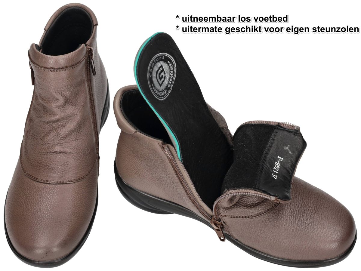 G-COMFORT by Grünwald schuhe artikel P-9521GY grau/grey YAK zijn taupe-grijs grainé yaklederen extra brede comfort damesschoenen hoog-comfort botjes of korte laarsjes of bootsjes van het Duitse schoenenbedrijf Glückschuh. Deze orthopedische/hoogcomfort vrouwen laarsjes hebben een extra brede H wijdte leest en zijn voorzien ritsen aan beide zijden van de schacht. In en uit stappen gaat super gemakkelijk! Deze comfort damesbootsjes zijn vervaardigd uit soepel en rekbaar taupe yakleder en het binnenwerk is zonder drukkende naden gemaakt uit zachte leder materialen. Het los uitneembaar voetbed kan zo nodig vervangen worden door eigen steunzolen. Voor vrouwen die comfort op de eerste plaats zetten. Top kwaliteit aan een zeer democratische prijs! G-comfort by Grünwald schoenen vindt men in onze schoenenwinkel regio Aalst, Ninove, Geraardsbergen, Zottegem, Liedekerke of kan men online bestellen op onze webshop.