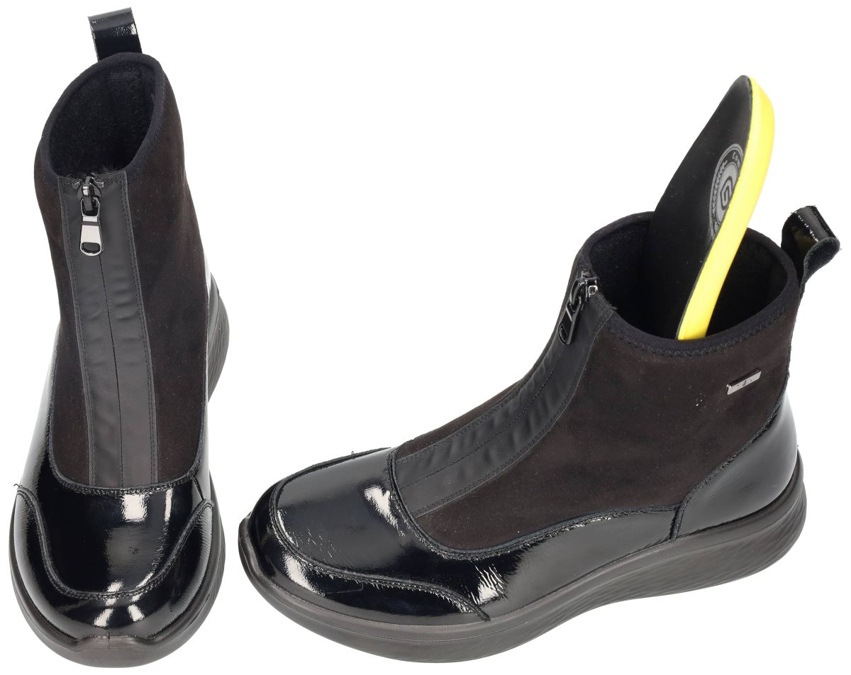 G Comfort P-817S Schwarz Lack – waterdichte korte regenlaarsjes met antislipzool en H-wijdte leest. De G Comfort P-817S schwarz lack zijn stijlvolle én praktische dameslaarsjes voor regen, sneeuw en koude dagen. Dit model combineert elegantie met functioneel comfort en is ideaal voor het najaar en de winter. Dankzij het glanzend zwart laklederlook bovenwerk en de rekbare stretch schacht sluiten deze laarsjes soepel aan rond de enkel, terwijl de ruime H-wijdte leest extra ruimte biedt voor wie een gemiddelde tot brede voet heeft. Zo geniet je van optimaal draagcomfort, zonder drukpunten. Deze G Comfort regenlaarsjes voor dames combineren stijl, waterdichtheid en stabiliteit in één ontwerp. De TEX-voering zorgt voor droge voeten, de stretch schacht sluit mooi aan en de brede H-wijdte leest voorkomt knelling, zelfs bij gezwollen voeten of hoge wreef. De TPU antislipzool garandeert bovendien maximale veiligheid bij glad weer. G Comfort regenlaarsjes P-817S schwarz lack – verkrijgbaar bij Schoenen Karo, specialist in comfortschoenen en waterdichte laarsjes voor dames met brede voeten.