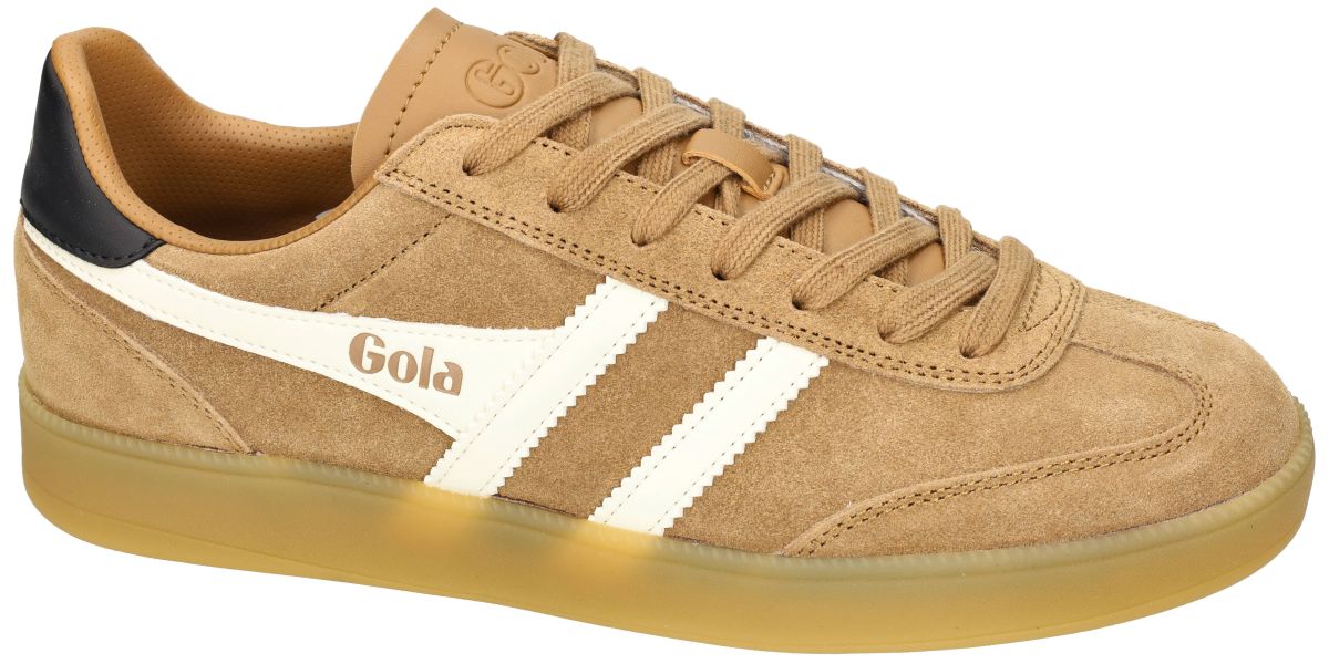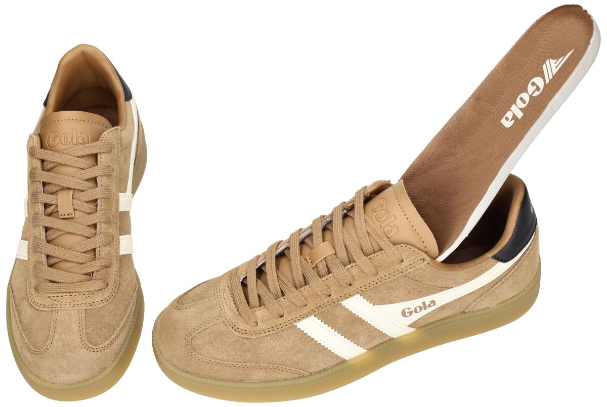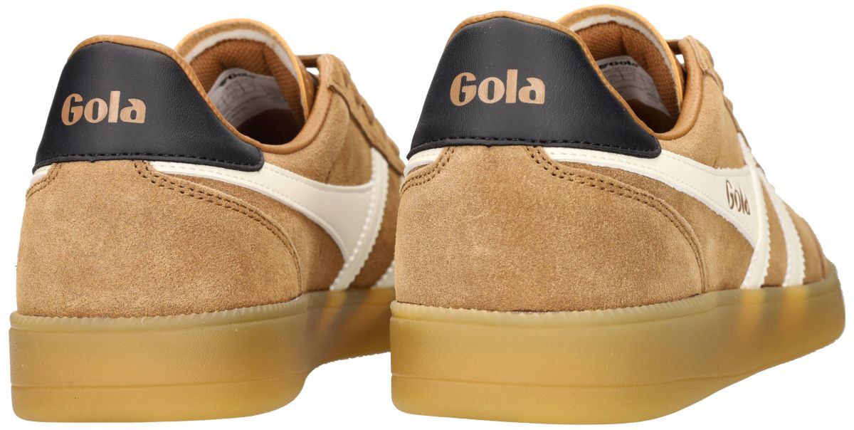 Gola – Viper CMB735 Tobacco/Off White/Black/Gum. De Gola Viper CMB735 is een authentieke herensneaker die het beste van retro Britse sportstijl combineert met hedendaags draagcomfort. Dit model ademt de sfeer van de jaren ’70 en ’80, toen Gola naam maakte op het voetbalveld en in de sporthal, maar is opnieuw ontworpen voor dagelijks gebruik met een verfijnde moderne afwerking. De upper is uitgevoerd in hoogwaardig suède in een warme ‘Tobacco’-kleur, afgewerkt met de iconische offwhite Gola-strepen aan de zijkant en een contrasterend zwart hielstuk. De combinatie van materialen en tinten zorgt voor een stijlvolle, casual uitstraling die moeiteloos past bij jeans of chino’s. De zool in gumkleurig rubber zorgt niet alleen voor die typische retrolook, maar biedt ook uitstekende grip en duurzaamheid. Binnenin is de sneaker voorzien van een uitneembaar voetbed en een voering in zacht microvezeltextiel, wat het draagcomfort verhoogt, ook bij langdurig gebruik. De Gola Viper valt op door zijn sportieve eenvoud, strakke belijning en oog voor detail — van het subtiel geperforeerde logo op de tong tot de ambachtelijke stiksels langs de randen. Heren die houden van vintage sneakers met moderne kwaliteit. De Gola Viper Tobacco/Off White/Black/Gum is de ideale allround sneaker — zowel voor dagelijks gebruik als voor wie zijn casual look wil aanvullen met een vleugje Britse sportgeschiedenis. Gola sneakers vindt men in onze schoenenwinkel regio Aalst, Ninove, Geraardsbergen, Zottegem, Liedekerke of kan men online bestellen op onze webshop.