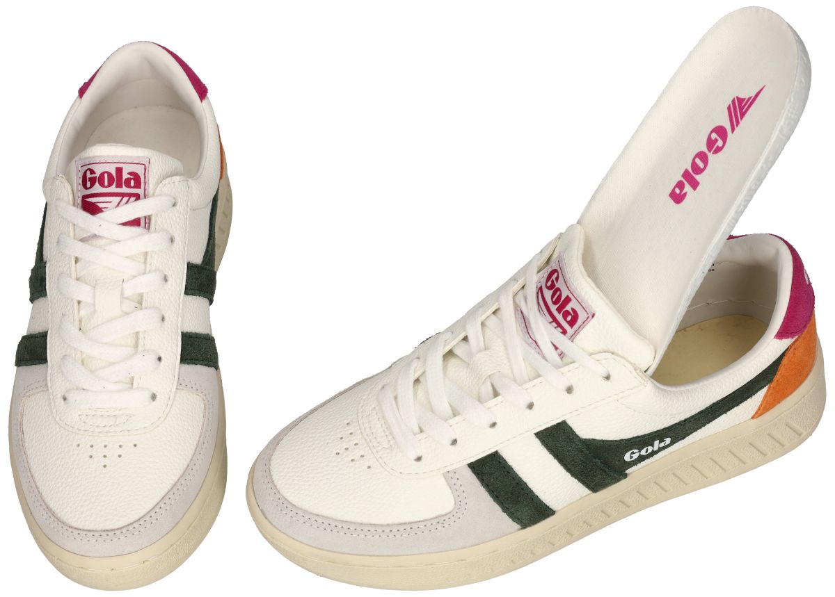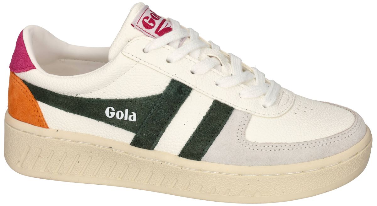 Deze stijlvolle dames sneakers uit de nieuwe lente/zomercollectie van het Britse merk Gola brengen een iconische retrolook samen met hedendaags comfort. Model Grandslam Trident met artikelnummer CLA415 in de uitvoering White / Dark Khaki / Fuchsia is geïnspireerd op klassieke tennissneakers en ademt het herkenbare sportieve DNA waar Gola wereldwijd om bekendstaat. De upper is uitgevoerd in wit generfd leder, gecombineerd met donkergroene (dark khaki) suède zijstrepen, een lichtgrijze suède neusafwerking en een opvallend fuchsia detail aan de hiel. Deze speelse maar harmonieuze kleurcombinatie geeft de sneaker een frisse, zomerse uitstraling met een uitgesproken retrokarakter. Het iconische Gola-logo op de zijkant en tong versterkt de authentieke vintage look. De lage plateauzool in offwhite zorgt voor een comfortabele demping en een stabiele tred, terwijl het licht geprofileerde loopvlak extra grip biedt bij dagelijks gebruik. Dankzij de klassieke vetersluiting sluit de sneaker mooi aan rond de voet en is hij gemakkelijk te combineren met zowel casual als sportieve outfits. Deze Gola Grandslam Trident is een ideale keuze voor vrouwen die houden van een tijdloze sneaker met karakter, kleur en Britse flair. Perfect voor lente- en zomerdagen, citytrips of een ontspannen vrijetijdslook met een modieuze twist. Gola sneakers vindt men in onze schoenenwinkel regio Aalst, Ninove, Geraardsbergen, Zottegem, Liedekerke of kan men online bestellen op onze webshop.