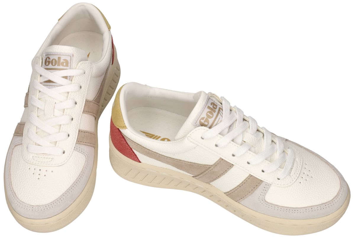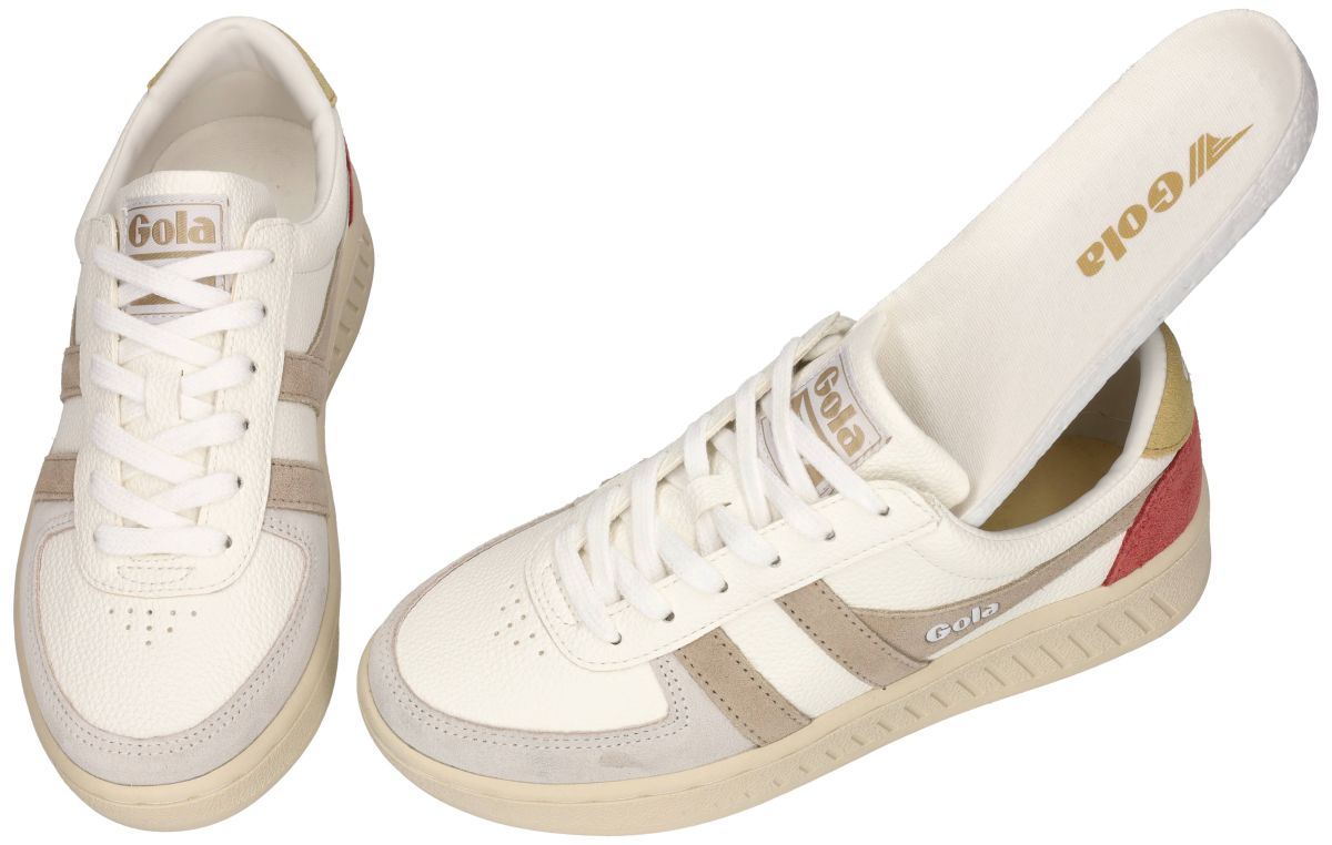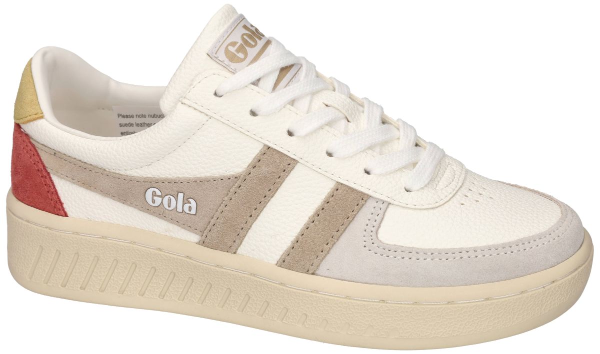 Deze stijlvolle dames sneakers uit de nieuwe lente/zomercollectie van het Britse merk Gola brengen een iconische retrolook samen met hedendaags comfort. Model Grandslam Trident met artikelnummer CLA415 in de uitvoering White / Bonei / Flax is geïnspireerd op klassieke tennissneakers en ademt het herkenbare sportieve DNA waar Gola wereldwijd om bekendstaat. De upper is uitgevoerd in wit generfd leder, gecombineerd met taupe suède zijstrepen of wingstripes, een lichtgrijze suède neusafwerking en een opvallend mosterdgeel en koraalrood detail aan de hiel. Deze speelse maar harmonieuze kleurcombinatie geeft de sneaker een frisse, zomerse uitstraling met een uitgesproken retrokarakter. Het iconische Gola-logo op de zijkant en tong versterkt de authentieke vintage look. De lage plateauzool in offwhite zorgt voor een comfortabele demping en een stabiele tred, terwijl het licht geprofileerde loopvlak extra grip biedt bij dagelijks gebruik. Dankzij de klassieke vetersluiting sluit de sneaker mooi aan rond de voet en is hij gemakkelijk te combineren met zowel casual als sportieve outfits. Deze Gola Grandslam Trident is een ideale keuze voor vrouwen die houden van een tijdloze sneaker met karakter, kleur en Britse flair. Perfect voor lente- en zomerdagen, citytrips of een ontspannen vrijetijdslook met een modieuze twist. Gola sneakers vindt men in onze schoenenwinkel regio Aalst, Ninove, Geraardsbergen, Zottegem, Liedekerke of kan men online bestellen op onze webshop.