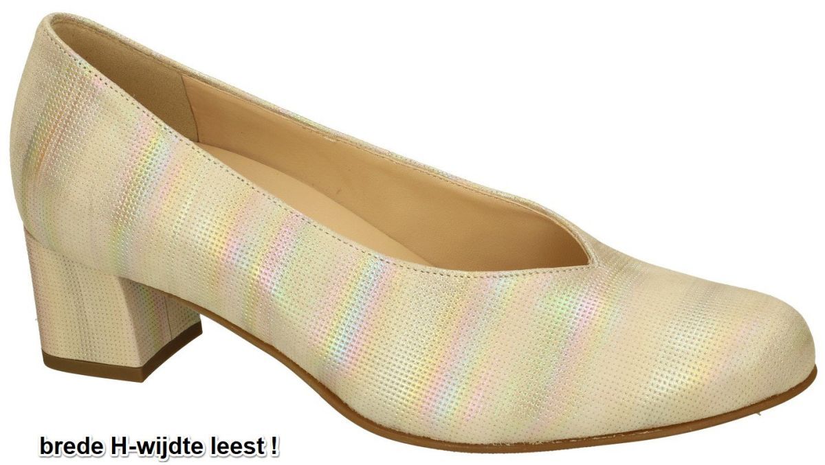 HASSIA artikel/model 7-30 4937 FLORENZ H 9200 irid Ombre-leder zijn damesschoenen zand-beige nubuck met metallic regenboog schijnsel geklede pumps of decolletéschoenen met brede H wijdte leest uit de nieuwe lente-zomer collectie 2024 van het Oostenrijkse schoenenmerk HASSIA. Deze brede en ruime HASSIA pumps staan op een beklede blokhak van 4,5 cm en zijn uitgevoerd met een zandkleurig met fijne rasterpuntjes geprikt nubuckleder met daarop een subtiele metaalglanzende regenboog strepen. Deze speciale en opvallende vrouwenpumps hebben een diep uitgesneden decolleté. Door de losse inlegzool weg te nemen kan nog meer volume worden gecreëerd zodat met deze HASSIA pumps zelfs dames met zware voeten toch een mooie geklede pump kunnen dragen. Ook zeer geschikt voor steunzolen! Oostenrijkse HASSIA damesschoenen vindt u in onze schoenenwinkel regio Aalst, Ninove of u kan online bestellen op onze webshop. Is uw maat niet op voorraad? Geen probleem bel of mail ons en we trachten u alsnog te helpen