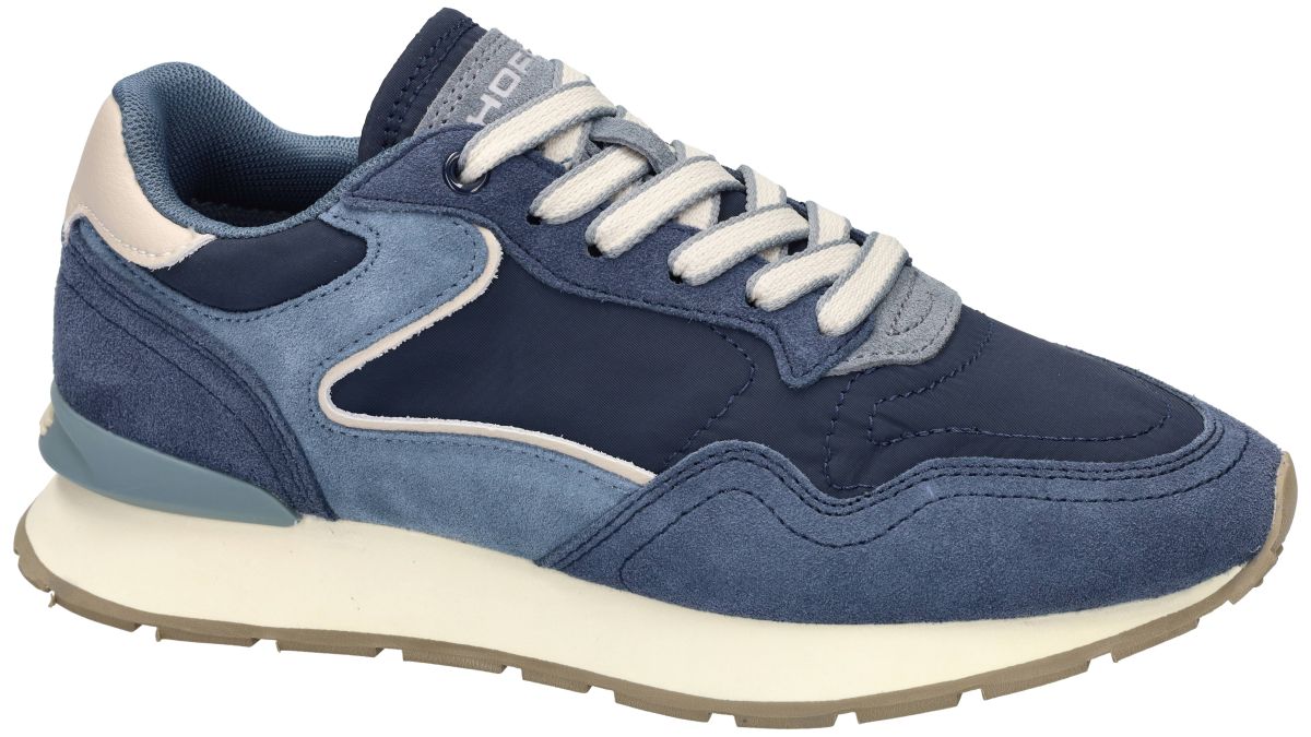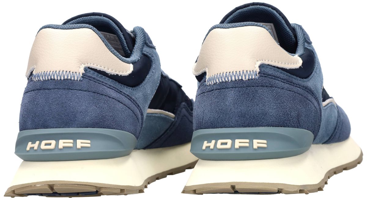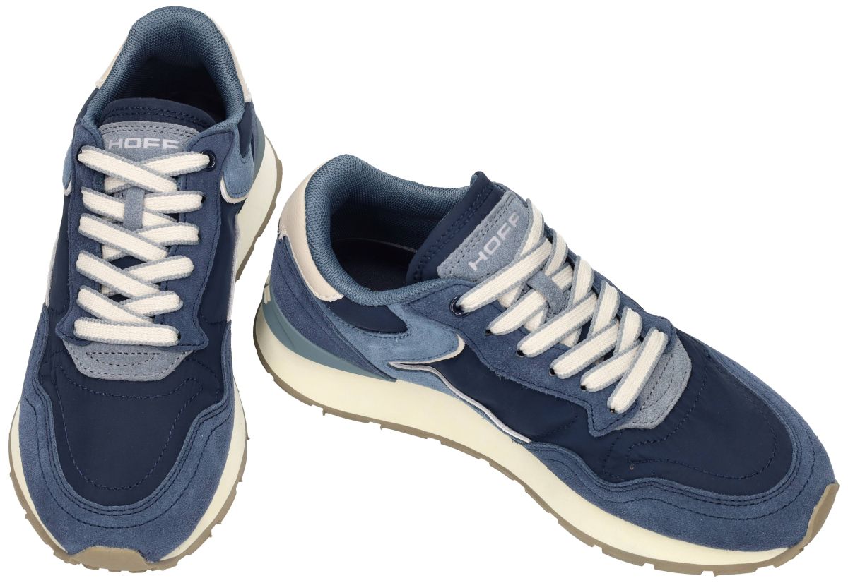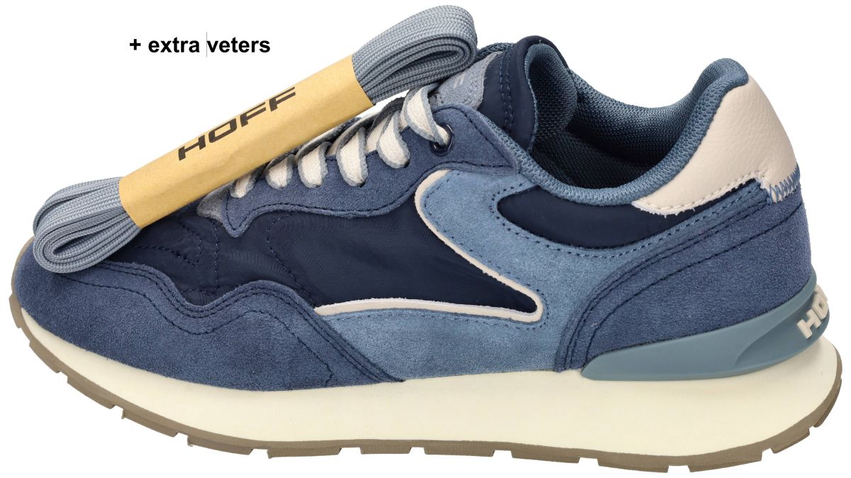 Deze Hoff runner sneakers uit de City-reeks in de stijlvolle Navy Blue uitvoering combineren een sportieve runnerlook met verfijnde, stedelijke elegantie. Dit model uit de nieuwste Hoff collectie is ontworpen voor wie comfort en design moeiteloos wil verenigen in een dagelijkse sneaker met een moderne uitstraling. Het bovenwerk is vervaardigd uit een hoogwaardige combinatie van zacht suède, nubuck en technisch textiel, uitgevoerd in diep marineblauw met subtiele contrasten in lichtblauw, off-white en beige. De gelaagde panelen en verfijnde stiksels geven de sneaker een dynamisch karakter, terwijl de kleurstelling zorgt voor een tijdloze en makkelijk combineerbare look. Aan de binnenzijde is deze Hoff City sneaker voorzien van een comfortabel, uitneembaar memory voetbed, ideaal voor langdurig draagcomfort tijdens actieve dagen. De licht gewatteerde kraag en tong sluiten mooi rond de voet aan en verhogen het loopcomfort. De lichte, dempende runnerzool in crèmekleurige uitvoering biedt uitstekende schokabsorptie, terwijl de rubberen loopzool met profiel zorgt voor goede grip en stabiliteit op verschillende ondergronden. Op de hiel is het Hoff-logo subtiel geïntegreerd als herkenbaar designelement. Dankzij zijn sportieve maar verfijnde uitstraling is deze Hoff Navy Blue City runner perfect inzetbaar voor zowel casual outfits als meer geklede, stedelijke looks. Een veelzijdige sneaker die moeiteloos meegaat van werkdag tot weekend. Een ideale keuze voor wie op zoek is naar een comfortabele, stijlvolle runner sneaker met een moderne city vibe en de herkenbare kwaliteit van Hoff. De grootste collectie Hoff sneakers vindt men in onze schoenenwinkel regio Aalst, Ninove, Geraardsbergen, Zottegem, Liedekerke of kunt u online bestellen op onze webshop.