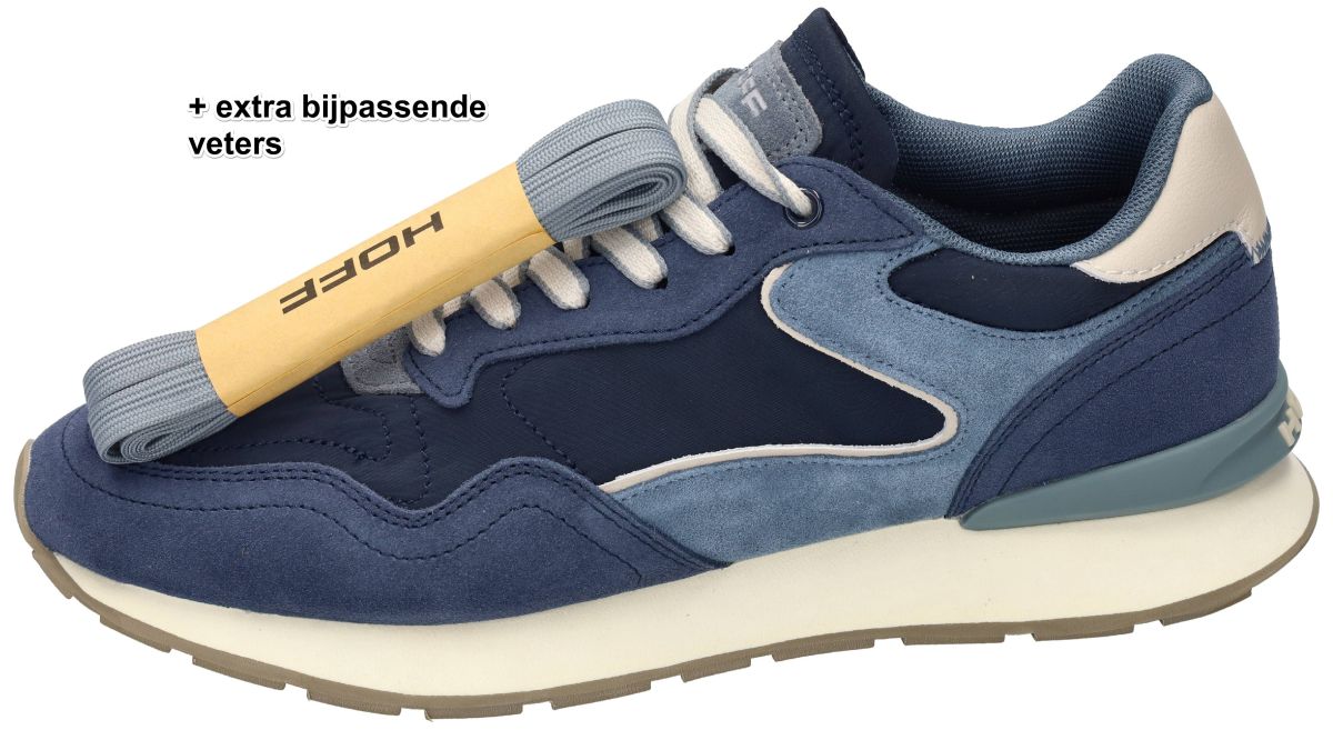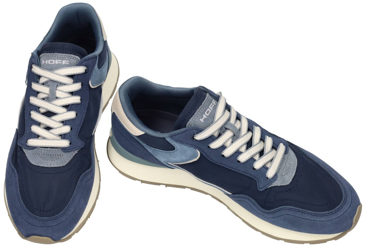 Deze Hoff heren runner sneakers uit de City-lijn in de uitvoering Navy Blue combineren een sportieve uitstraling met verfijnde materialen en hedendaags comfort. Zoals je van Hoff mag verwachten, staat ook dit model garant voor een doordachte mix van design, draagcomfort en veelzijdigheid. Het bovenwerk bestaat uit een harmonieuze combinatie van donkerblauw nylon, suède in verschillende blauwtinten en subtiele crèmekleurige accenten, wat deze sneaker een moderne maar tijdloze look geeft. De contrasterende details en de gelaagde afwerking zorgen voor die typische City-stijl: strak, urban en perfect in balans. Binnenin is de sneaker voorzien van een comfortabel memory-voetbed, dat zich aanpast aan de vorm van de voet en optimale demping biedt tijdens het stappen. De lichte, schokabsorberende zool met rubberen loopvlak zorgt voor stabiliteit en grip, zowel in de stad als onderweg. Extra praktisch detail: deze Hoff City Navy Blue wordt geleverd met extra bijpassende veters, zodat je eenvoudig kunt afwisselen in stijl of kleuraccent. Wanneer en hoe te dragen? Deze Hoff City runner is bijzonder veelzijdig en laat zich moeiteloos combineren bij uiteenlopende gelegenheden: Casual & dagelijks: perfect bij een jeans of chino met een T-shirt, polo of casual hemd. Smart casual: combineer met een nette broek en een fijngebreide trui of blazer voor een verzorgde, moderne look. Vrije tijd & city trips: ideaal voor wandelingen, weekenduitstappen of een dag in de stad dankzij het lichte en comfortabele draaggevoel. Kortom, deze Hoff City Navy Blue heren sneakers zijn de ideale keuze voor mannen die houden van een stijlvolle sneaker met sportieve roots, een hoog comfortniveau en eindeloze combinatiemogelijkheden – van doordeweeks tot ontspannen weekendmomenten. Hoff heren of mannen sneakers kan men kopen in onze schoenenwinkel regio Aalst, Ninove, Geraardsbergen, Zottegem, Liedekerke of online bestellen op onze webshop.