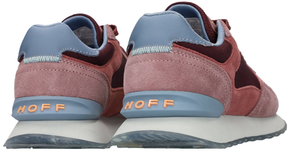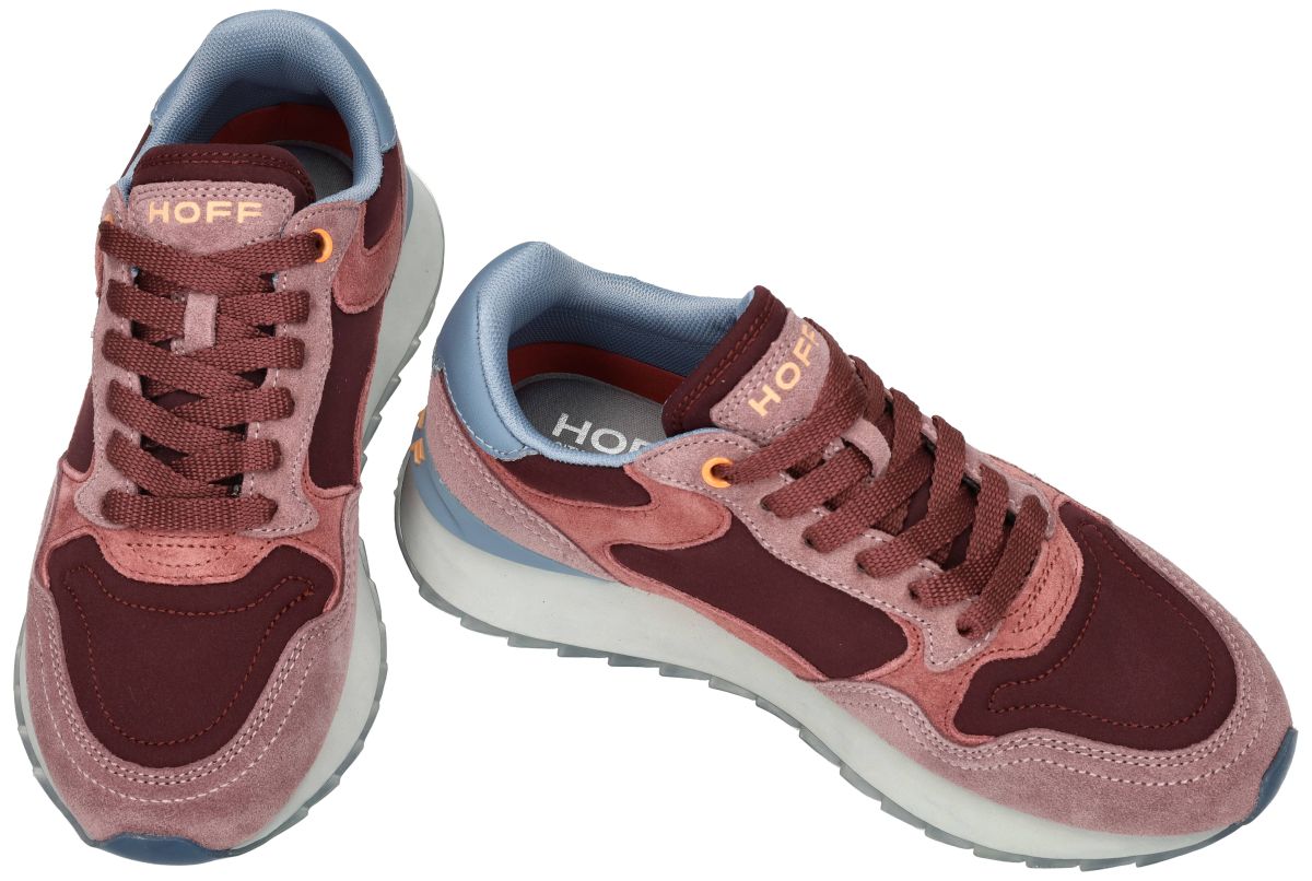 HOFF City Copenhagen – een stijlvolle damessneaker in warme bordeaux- en pasteltonen Deze Copenhagen-sneaker uit de City-reeks van HOFF combineert een modern silhouet met een opvallende, vrouwelijke kleurenmix. Het bovenwerk bestaat uit een harmonie van diep bordeauxrode panelen in mesh aangevuld met suède overlays in oudroze en zachtroze tinten. Het geheel wordt stijlvol afgewerkt met een lichtblauwe hielkap en een pastelblauwe binnenvoering, wat de sneaker een frisse, eigentijdse uitstraling geeft. De tong en veters in warm bordeaux versterken het kleurenspel, terwijl subtiele accenten zoals perzik-oranje HOFF-branding op de tong en hiel voor een speelse toets zorgen. De sneaker staat op een lichtgewicht, zachte zool in offwhite, die je de hele dag door aangenaam comfort biedt. Een typisch City-collectie-detail is de transparante rubberzool met een gedetailleerde stadsprint van Kopenhagen – een echte signature van HOFF, die deze sneaker uniek maakt in zijn soort. Deze sneaker is ideaal voor vrouwen die graag kleur en stijl combineren zonder in te boeten op comfort. Met de HOFF City Copenhagen geef je iedere outfit moeiteloos een modieuze upgrade. De nieuwste Hoff schoenen collectie vindt men in onze schoenenwinkel regio Aalst, Ninove, Geraardsbergen, Zottegem, Liedekerke of kan men online bestellen in onze webshop.