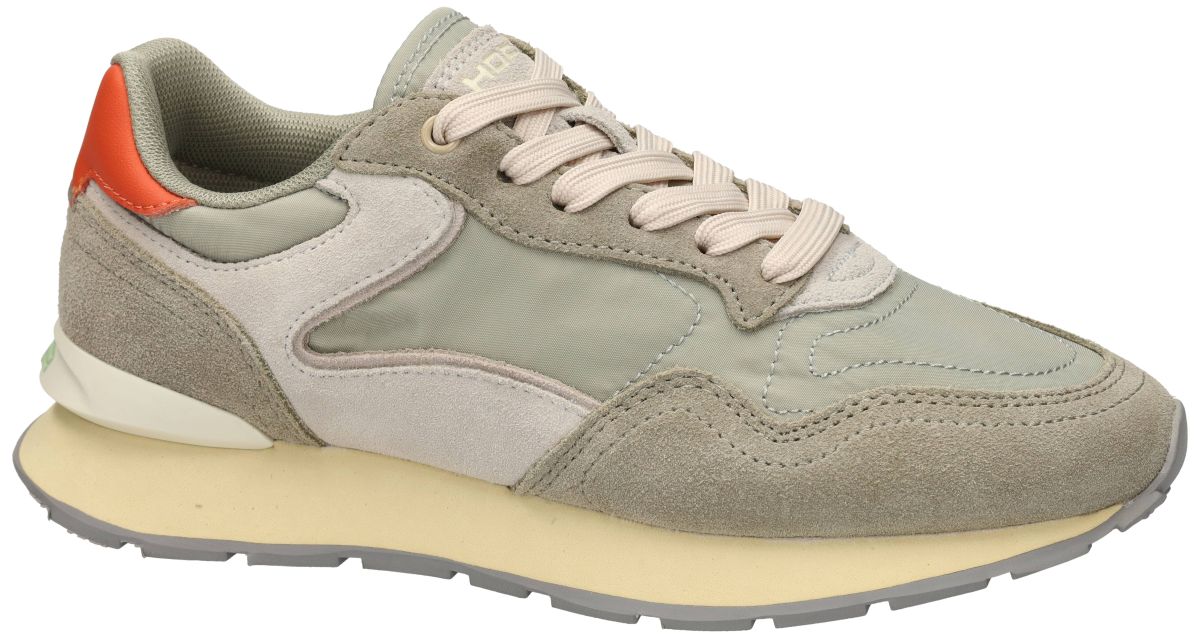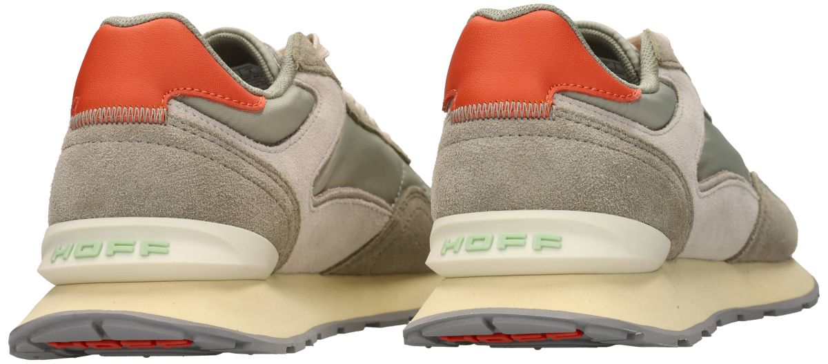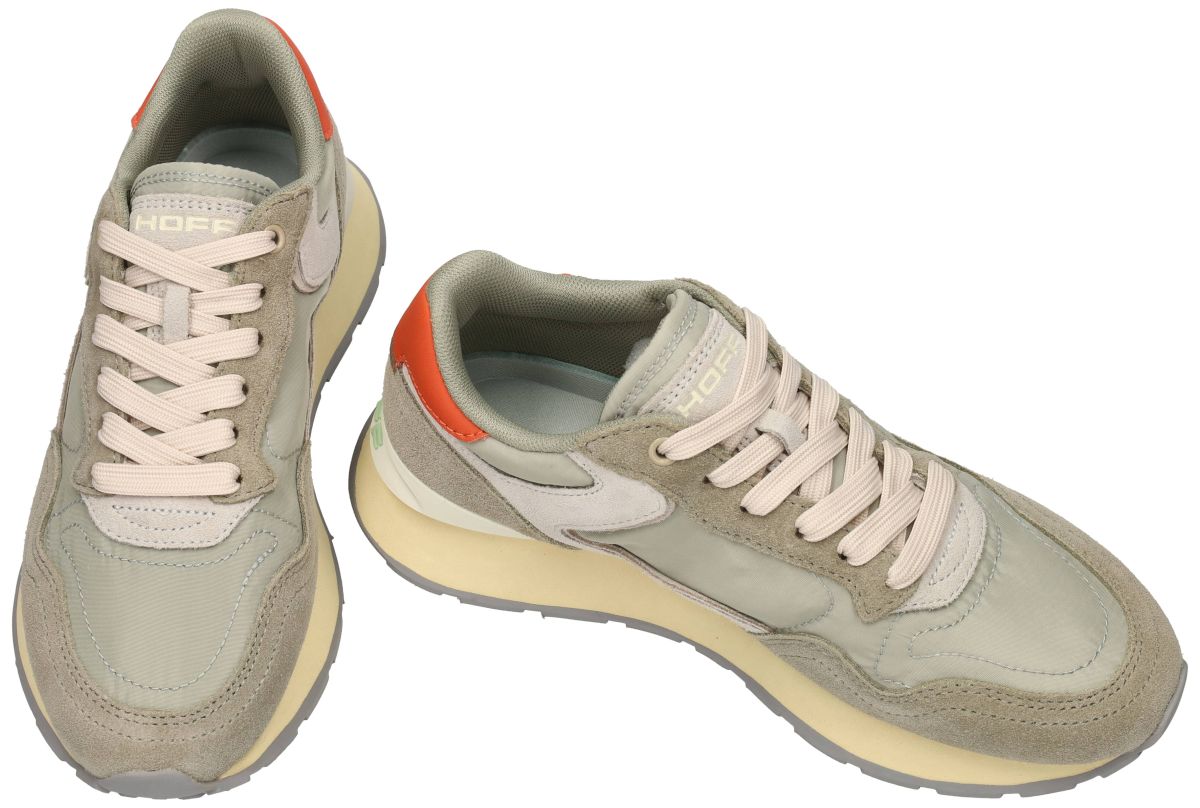 Deze Hoff runner sneakers uit de City-lijn in de verfijnde Retro Sage uitvoering combineren een tijdloze runnerstijl met zachte natuurtinten en modern draagcomfort. Dit model uit de nieuwste Hoff collectie is perfect voor wie houdt van een rustige, stijlvolle sneaker met een subtiele retro-uitstraling. Het bovenwerk is opgebouwd uit een kwalitatieve mix van suède, ruw nubuck en technisch textiel, uitgevoerd in zachte salie- en grijsgroene tinten, aangevuld met off-white accenten en een warm oranje detail aan de hiel. Deze uitgebalanceerde kleurencombinatie zorgt voor een frisse maar ingetogen look die moeiteloos combineert met zowel lichte als neutrale outfits. De gelaagde panelen en fijne stiksels benadrukken de zorgvuldige afwerking. Aan de binnenzijde is deze Hoff City runner voorzien van een comfortabel, uitneembaar memory-foam voetbed. Dit voetbed vormt zich naar de voet en biedt aangename demping en ondersteuning bij elke stap, ook tijdens langere wandelingen. De licht gewatteerde kraag en tong dragen bij aan een stabiele en comfortabele pasvorm. De lichte, schokabsorberende runnerzool in crèmekleurige uitvoering zorgt voor een vlotte afwikkeling van de voet, terwijl de rubberen loopzool met profiel extra grip en stabiliteit biedt. Het subtiel geïntegreerde Hoff-logo op de hiel maakt het geheel stijlvol af. Dankzij de rustige Retro Sage kleurstelling is deze City runner een veelzijdige sneaker die zowel casual als iets gekleder gedragen kan worden. Een ideale keuze voor dagelijks gebruik met oog voor comfort en design. Een perfecte sneaker voor wie op zoek is naar comfort, kwaliteit en een rustige, moderne uitstraling, kenmerkend voor Hoff. De grootste collectie Hoff sneakers vindt men in onze schoenenwinkel regio Aalst, Ninove, Geraardsbergen, Zottegem, Liedekerke of kunt u online bestellen op onze webshop.