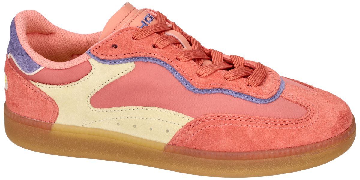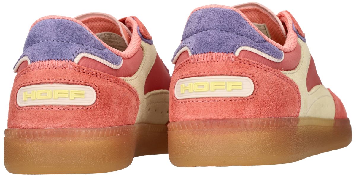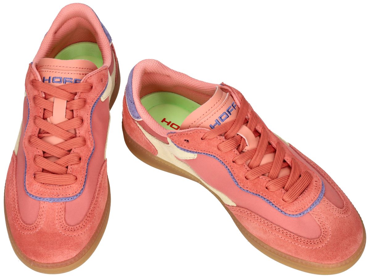 Deze Hoff sneakers uit de Park-reeks in de opvallende Coral uitvoering brengen kleur, comfort en karakter samen in één stijlvol ontwerp. Dit model uit de nieuwste collectie is geïnspireerd op levendige park- en city vibes en vormt een echte blikvanger binnen het hedendaagse sneakersegment. Het bovenwerk bestaat uit een hoogwaardige mix van zacht suède, glad leer en ademend textiel, uitgevoerd in warme koraal of donker roze tinten die harmonieus worden aangevuld met accenten in vanillegeel, lila en zachtroze. Het speelse kleurcontrast geeft deze sneaker een frisse, modieuze uitstraling zonder aan elegantie in te boeten. De verfijnde stiksels en gelaagde panelen benadrukken de kwaliteit en het oog voor detail waar Hoff om bekendstaat. Binnenin is de sneaker voorzien van een comfortabel, uitneembaar memory voetbed, ideaal voor langdurig draagcomfort in het dagelijks gebruik. De licht gewatteerde kraag en tong zorgen voor een aangename omsluiting van de voet. De transparante rubberen zool met subtiel profiel biedt goede grip en stabiliteit en versterkt tegelijk de sportieve, moderne look. Op de zool en hiel is het Hoff-logo stijlvol geïntegreerd als herkenbaar designelement. Dankzij de warme koraalrode kleurstelling is deze Hoff Park sneaker perfect te combineren met zomerse outfits, jeans of lichte casual looks. Een ideale keuze voor wie houdt van kleur, comfort en een modieuze sneaker met persoonlijkheid. Hoff sneakers kan men kopen in onze schoenenwinkel regio Aalst, Ninove, Geraardsbergen, Zottegem, Liedekerke of online bestellen op onze webshop.